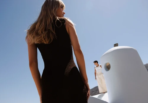 Look into the soul of Santorini through a conceptual lens drawing from the freedom of vintage island fashion aesthetic. Backstage dressing rooms and high-summer palettes feel like stills of you, from a slow, beautiful editorial.