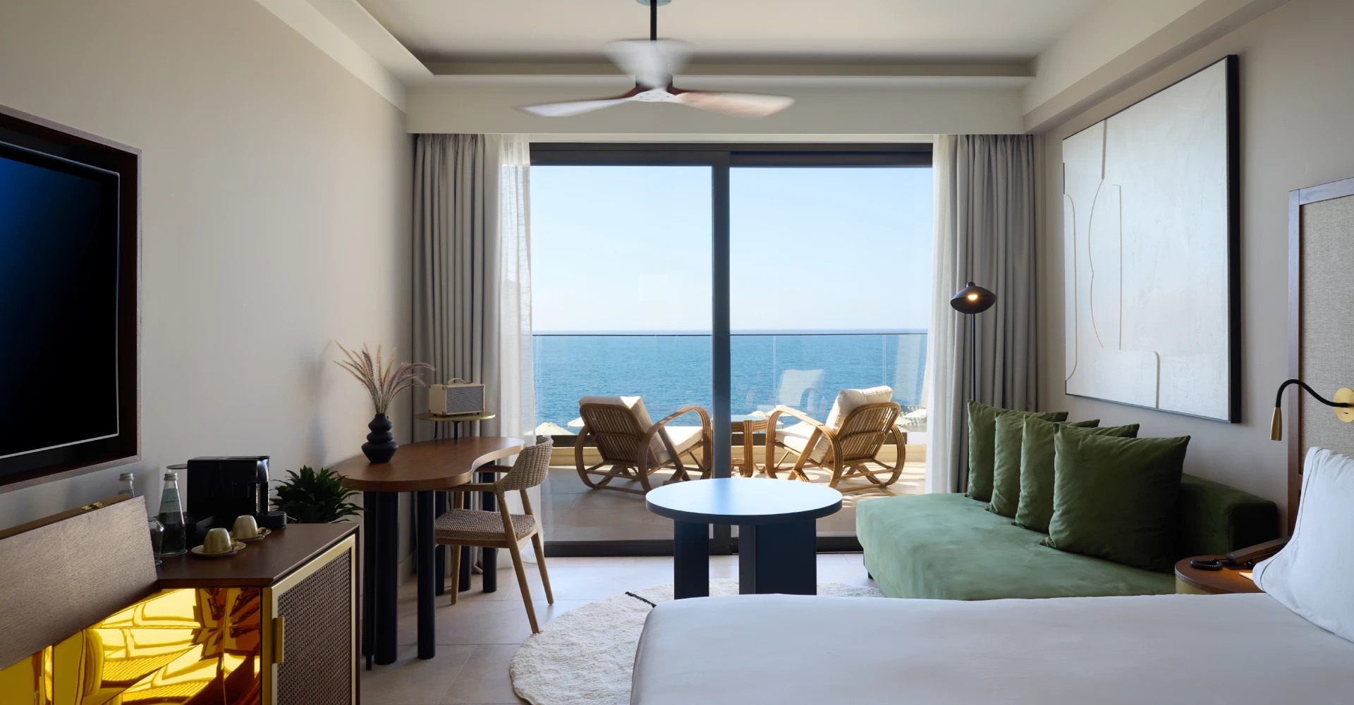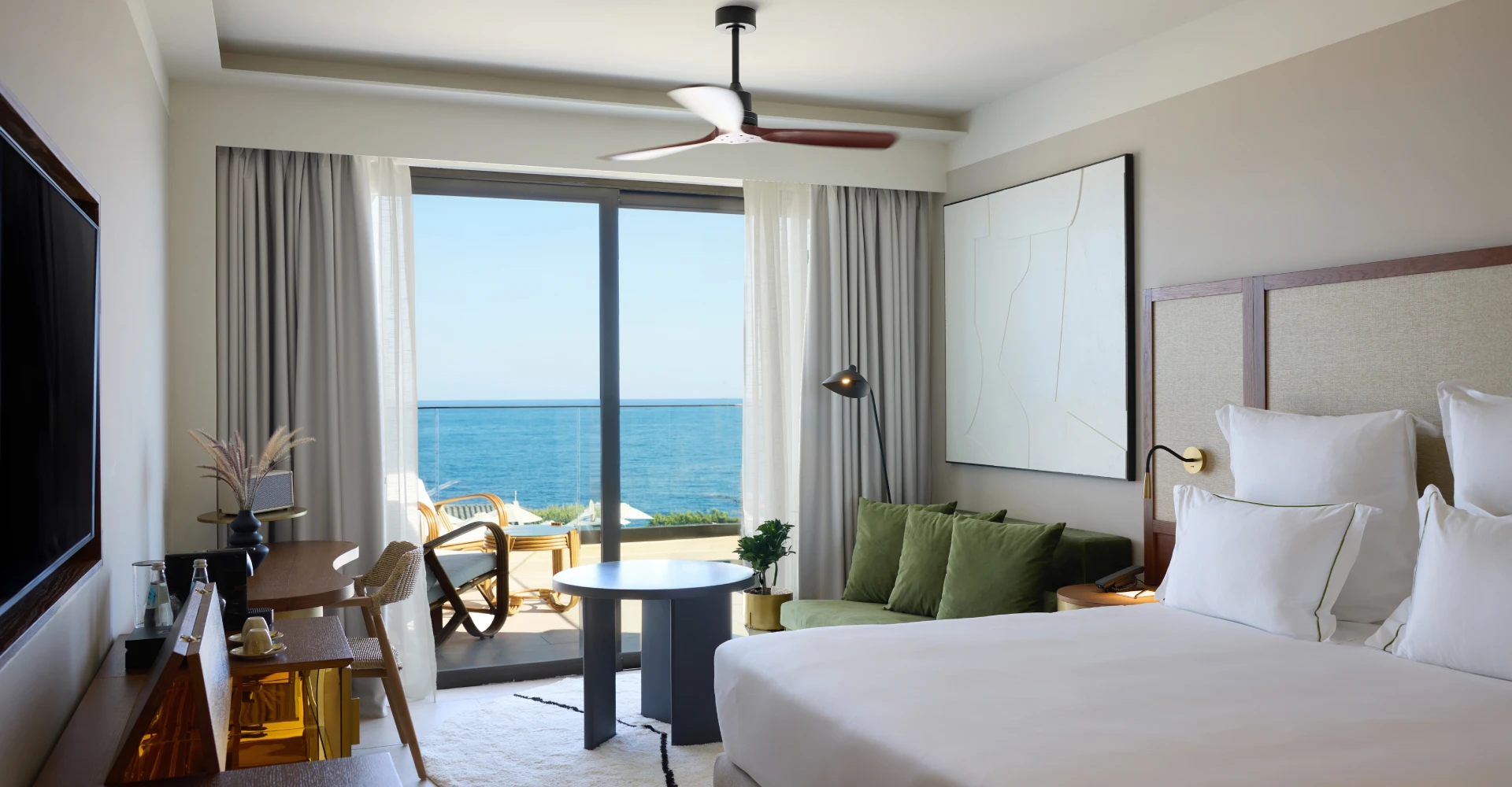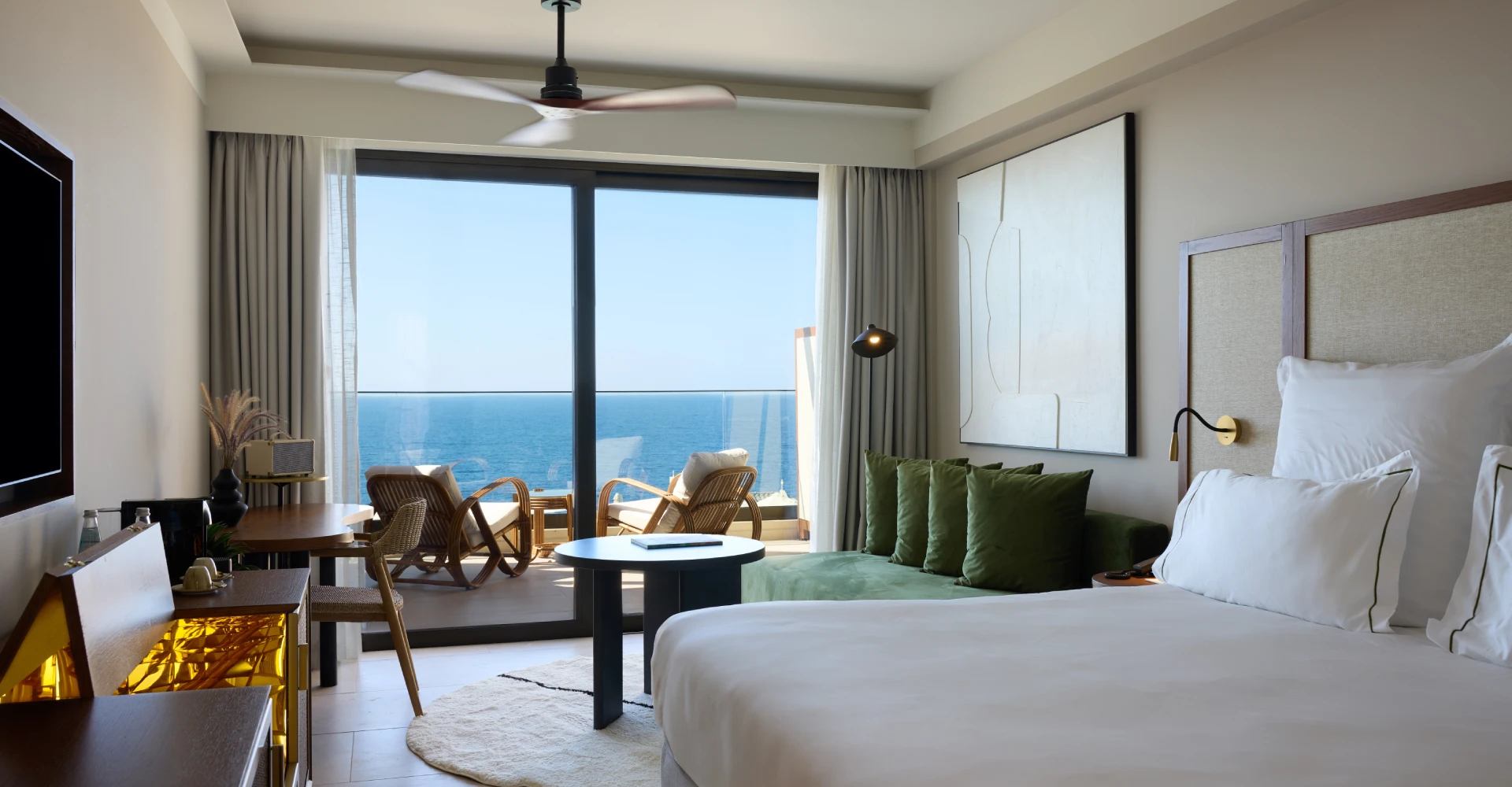 Refined room with king-size bed, stunning sea views, spacious lounge, furnished balcony, and en-suite bathroom. Located in the resort’s main building. Designed for 2 adults.