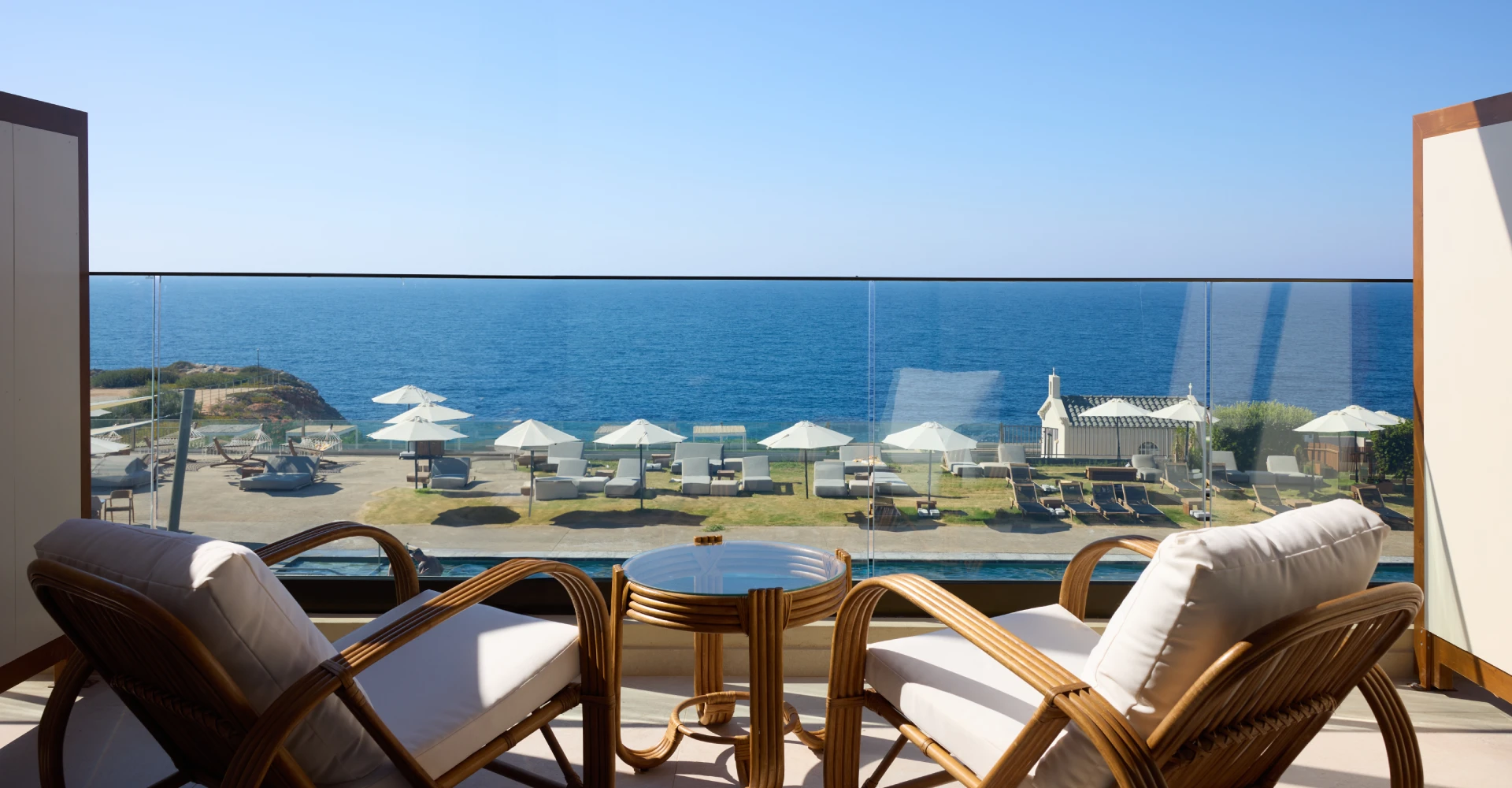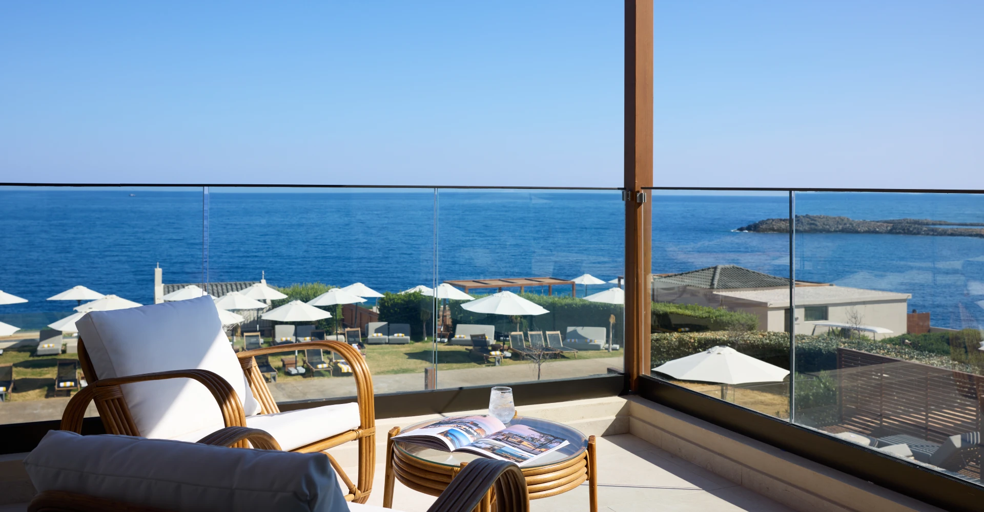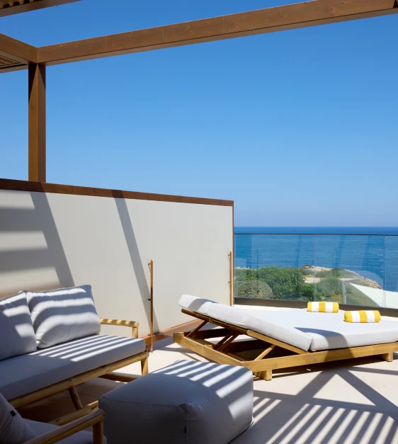 Refined room with king-size bed, stunning sea views, spacious lounge, furnished balcony, and en-suite bathroom. Located in the resort’s main building. Designed for 2 adults.