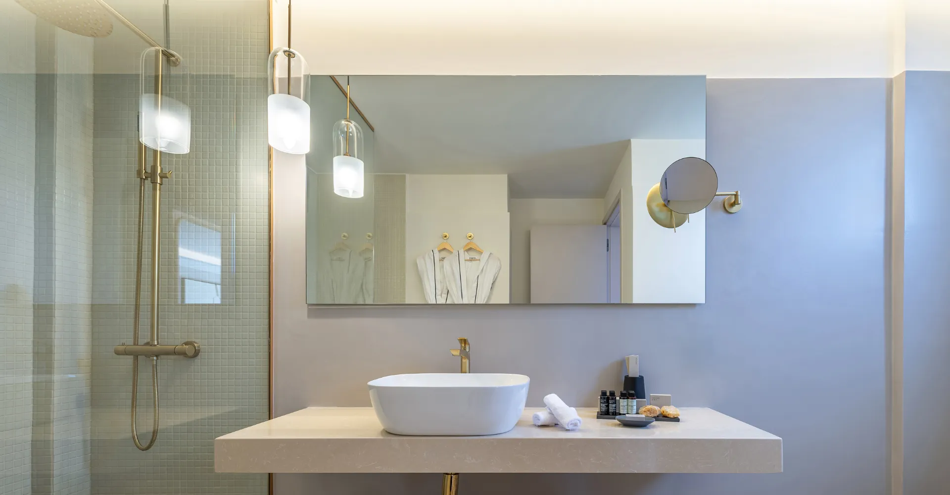 Set among lush tropical gardens, this open-plan suite blends natural tones with effortless comfort. Step out to a shared pool from your private veranda or unwind indoors with a soothing palette, plush bedding, complimentary minibar, and thoughtful amenities designed for laid-back Cretan days.