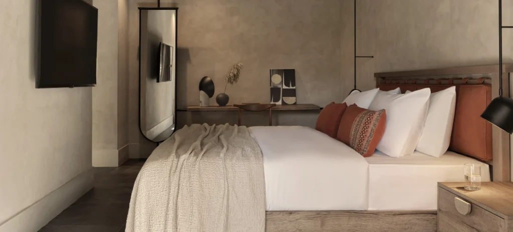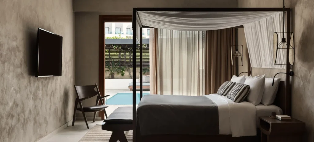 Rooms and suites feel like private island homes. Earthy tones, woven textures, shaded terraces, and greenery at every turn. Families spread out in multi-bedroom layouts, connecting rooms, and private-pool hideaways designed for slow mornings and easy togetherness. Indoor and outdoor spaces flow as one, creating calm, sunlit sanctuaries where your family can settle, reconnect, and live the Rhodes rhythm at their own pace.