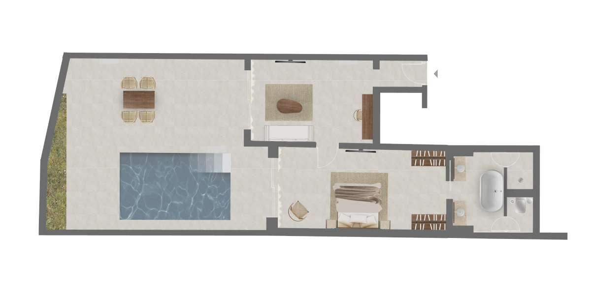 Crafted for spacious, laid-back living, this suite pairs earthy elegance with generous indoor-outdoor flow. Relax in the secluded garden, dip into your private pool, and gather for slow meals beneath the sky. Complete with a complimentary minibar and warm, tactile design, it’s home, only softer.