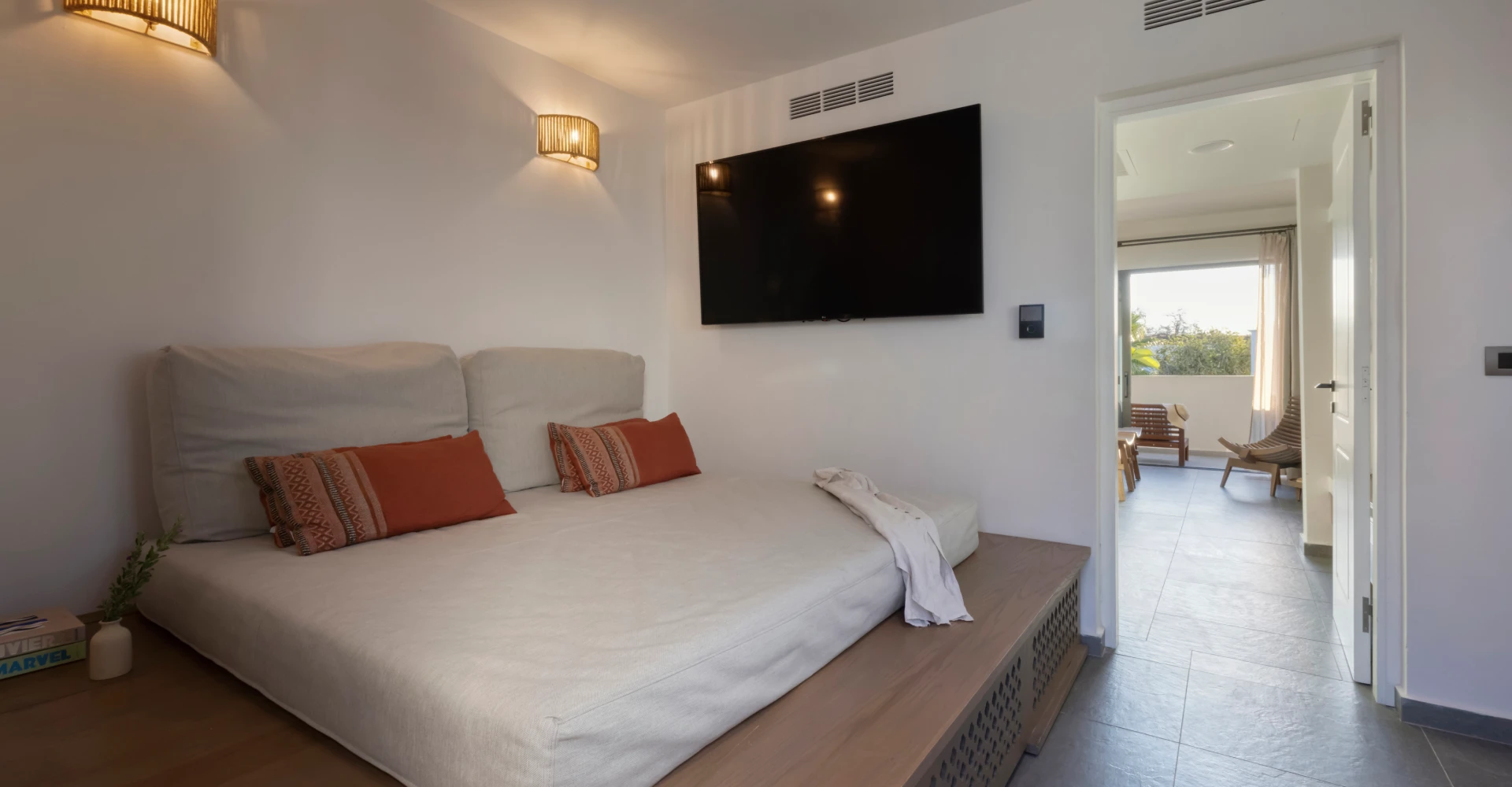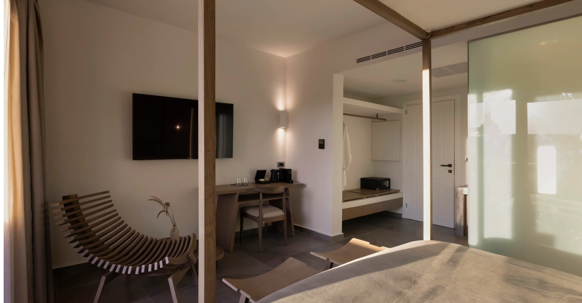 Designed for ease and connection, this suite offers a private home-like setting with warm tones, soft textures, and generous living space. A four-poster bed and double shower elevate everyday rituals, while the shaded balcony and complimentary minibar invite slow afternoons in the garden breeze.