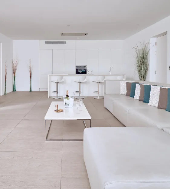 This airy one-bedroom suite includes a double bed, single bed, a light-filled living room with chaise longue, and a fully equipped kitchen. Step onto your private terrace with pool and soak in the Atlantic breeze, perfect for those seeking stillness, light, and the rhythm of the sea.