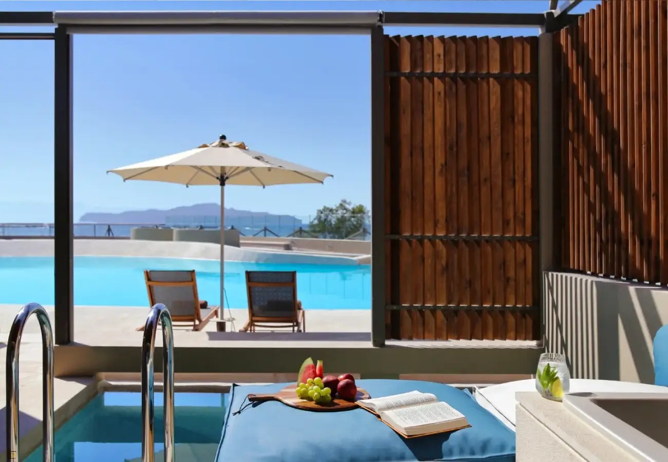 Stay in our Wellness Loft Pool View with Outdoor Jacuzzi and enjoy a curated lifestyle escape, where well-being, design, and seaside living come together, complete with a complimentary 3-course lunch at Topos.