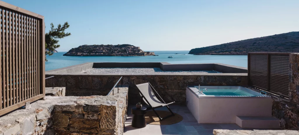 With Jacuzzis or plunge pools, sea-view terraces, and rooms made for two, the mood is sophisticated, cosmopolitan, and romantically luxurious with the closest view to Spinalonga Island across the water.