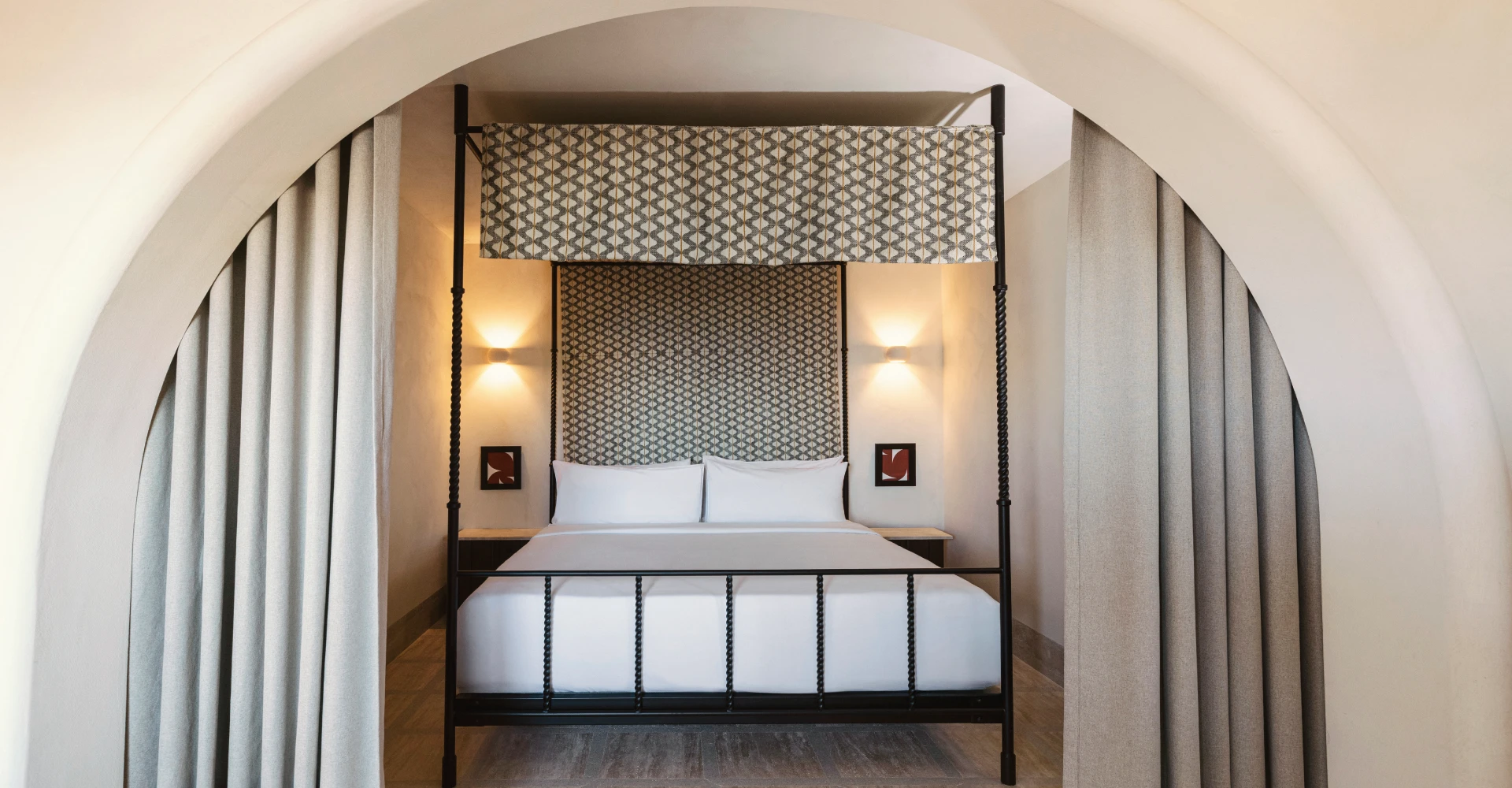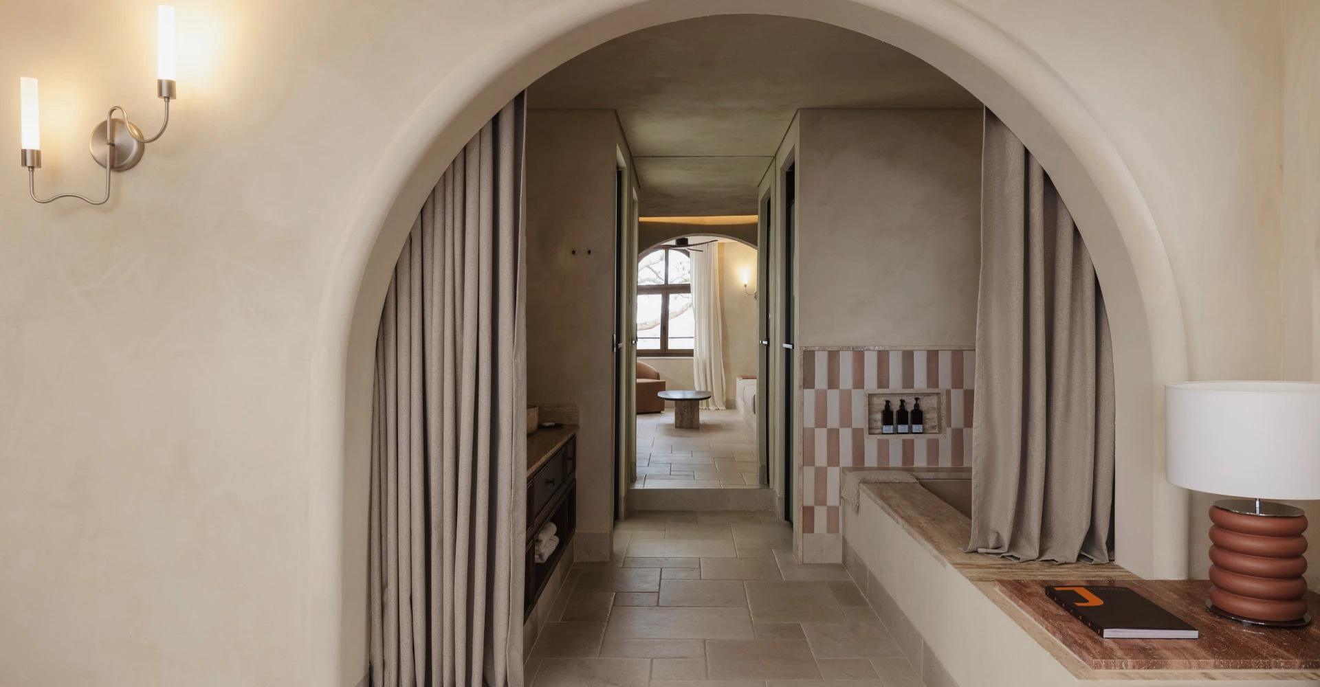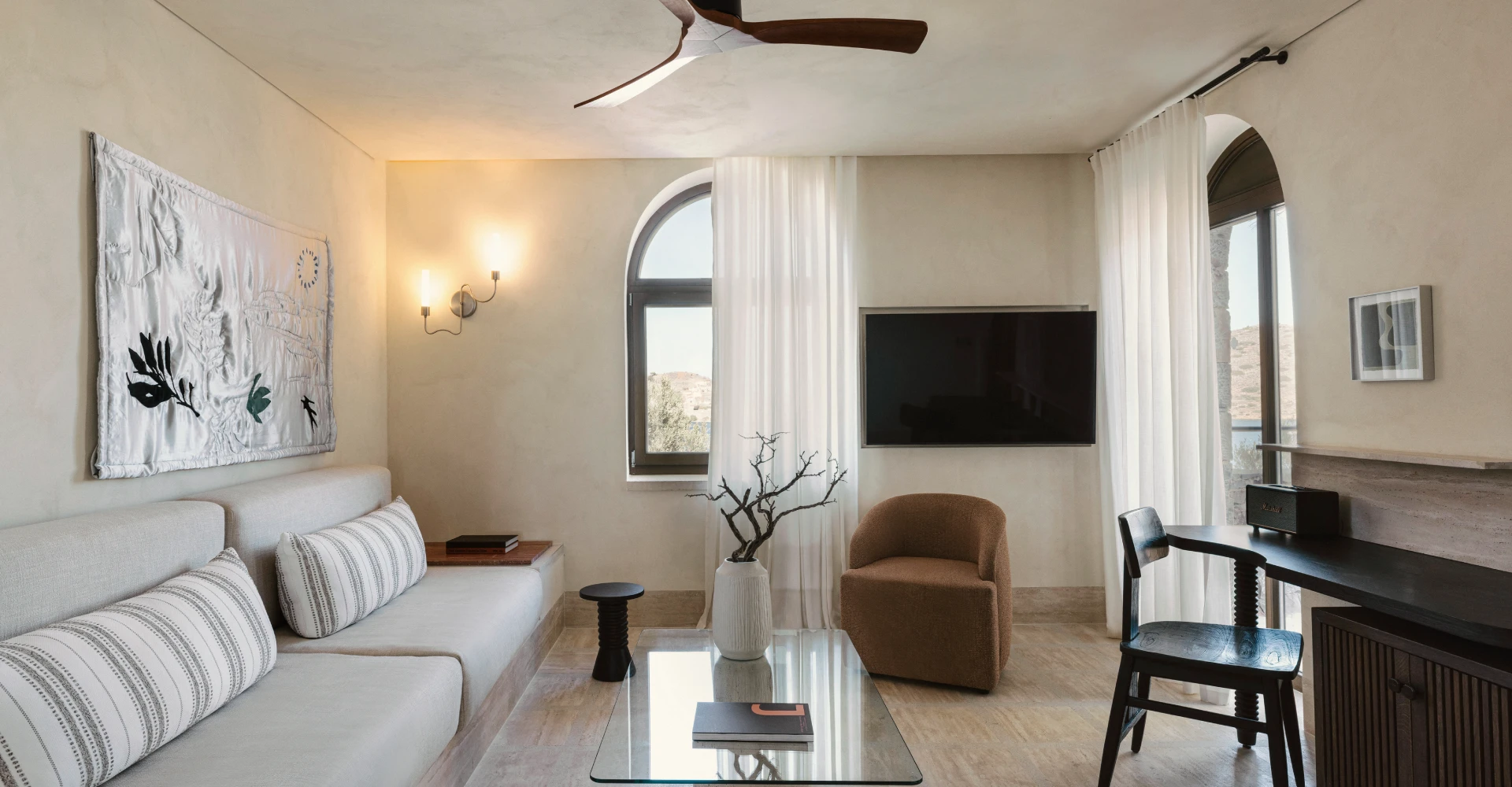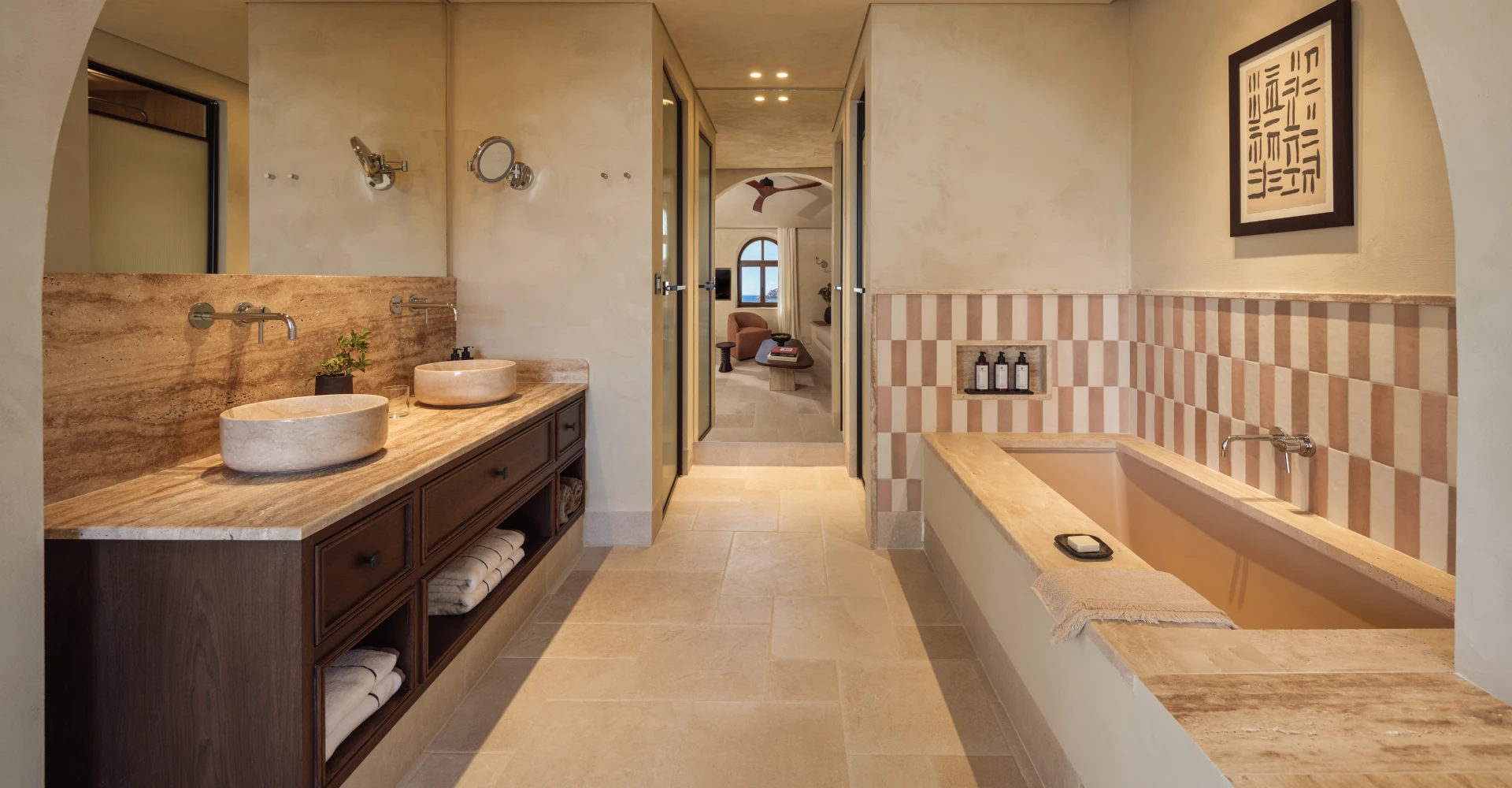 Intime et poétique, cette suite d’une chambre associe des intérieurs dans les tons de terre à des détails bien pensés, un boudoir garni, du carrelage rayé, des chaises sculpturales et un salon à la lumière tamisée. À l’extérieur, votre terrasse privée est équipée d’un jacuzzi ou d’une piscine et offre une vue imprenable sur la mer. C’est le lieu le plus proche du château vénitien sans quitter votre lit.