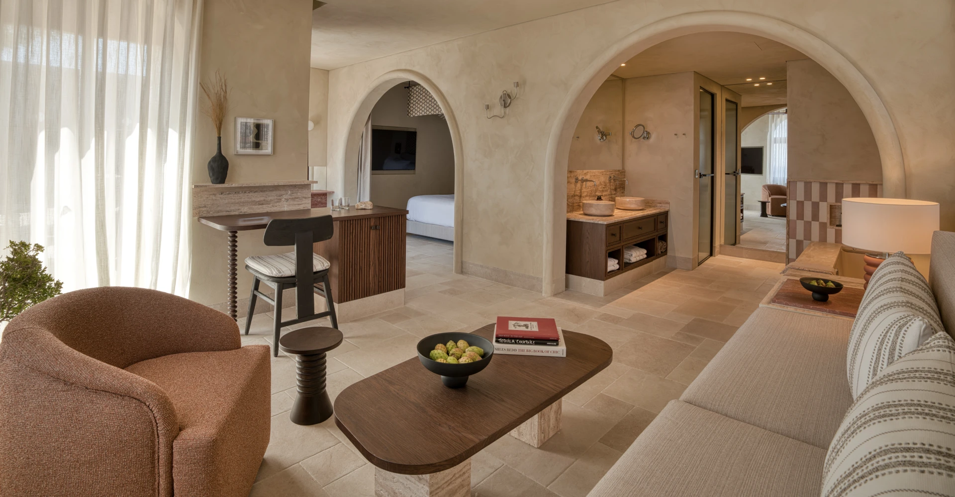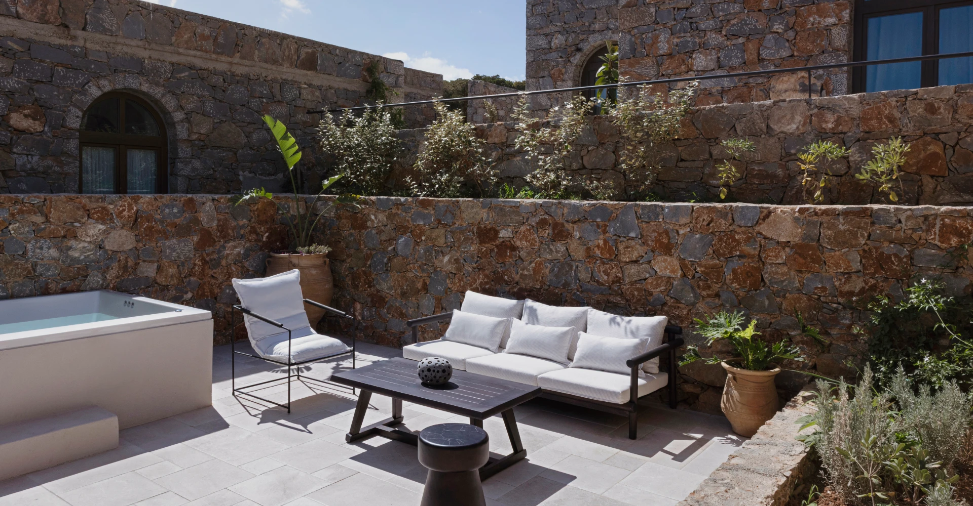 Suite en pierre d’une chambre avec lit king size, douche et baignoire, salon séparé, terrasse avec vue sur la mer, jacuzzi ou piscine privés, et intérieurs neutres et élégants.
