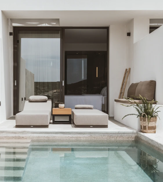 Mit einem Plunge-Pool, einem Balkon, elegantem Design und hochwertiger Ausstattung sind diese Suiten die perfekte Wahl für Paare, die ein stilvolles Ambiente, ein ausgezeichnetes Preis-Leistungs-Verhältnis und einen atemberaubenden Blick auf den Pool oder den Horizont genießen möchten..