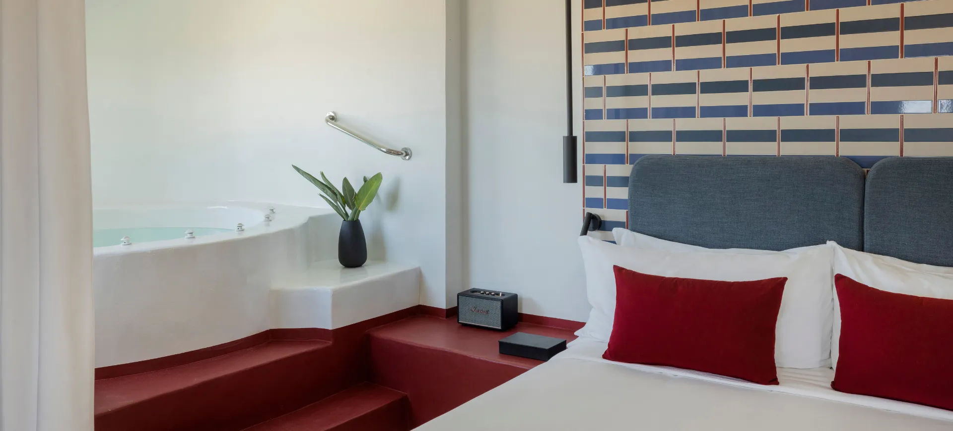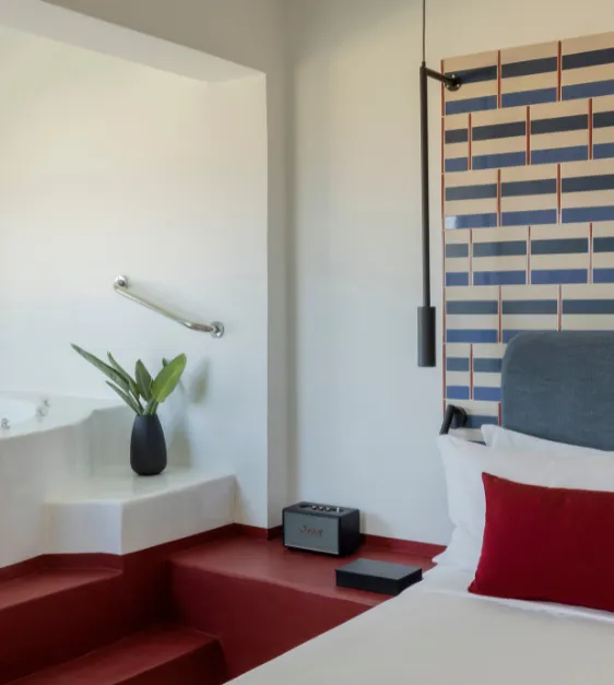 Geometric patterns, bold red accents, and playful details define this stylish suite. Relax in the indoor jacuzzi or on your cozy balcony with side sea views. Includes Marshall speaker, Naxos Apothecary amenities, fashion displays, bijouterie, shoe forms, hatbox and exclusive Neema brand extras for an inspired Santorini escapade.