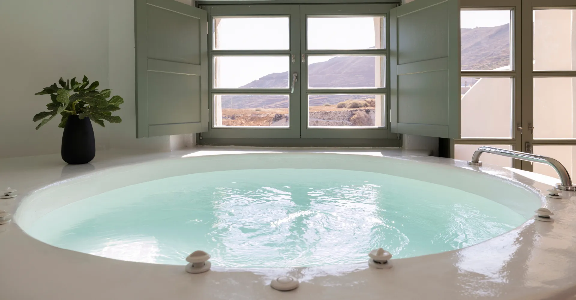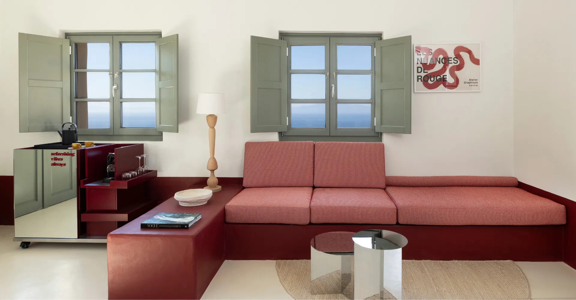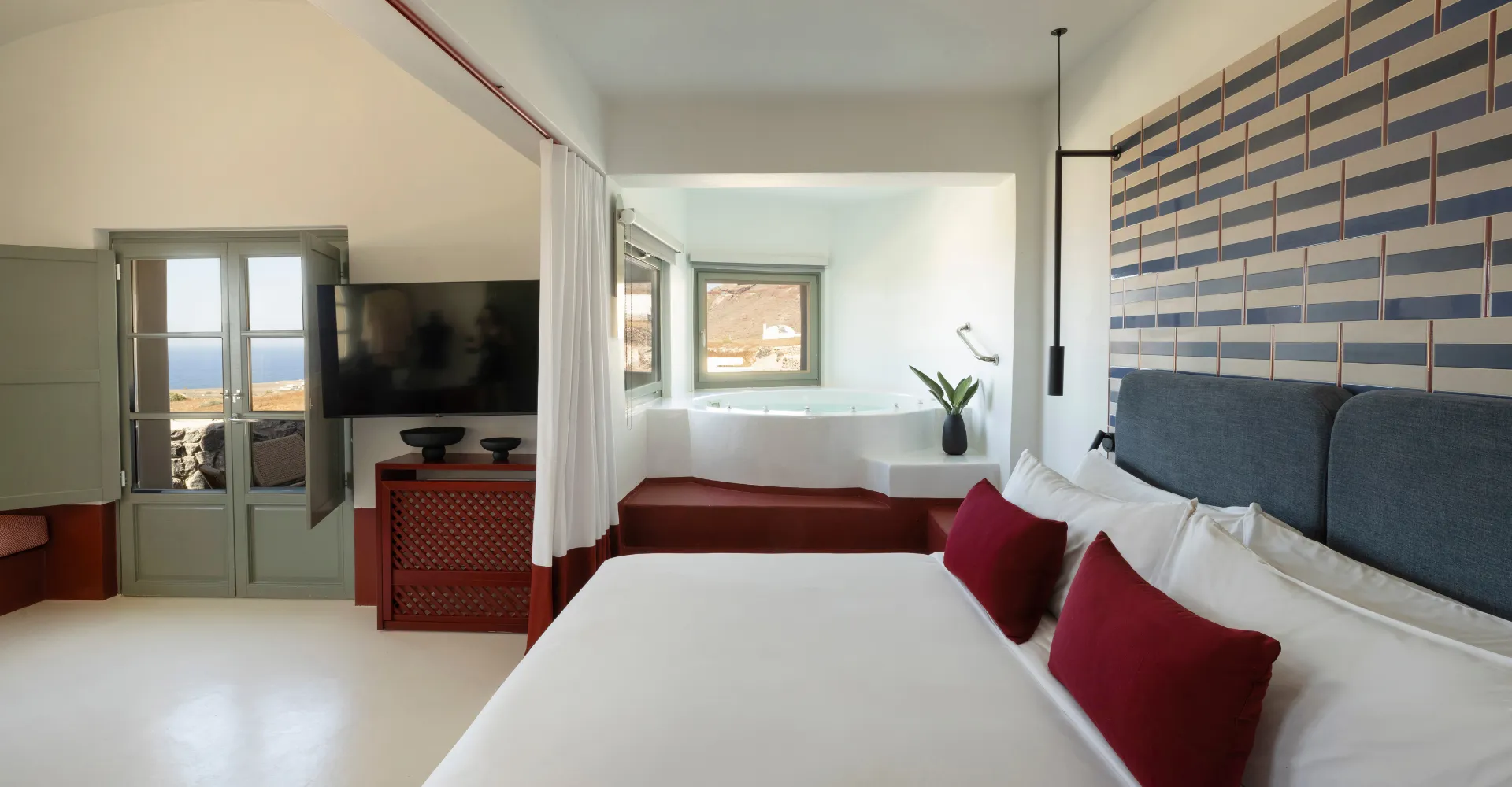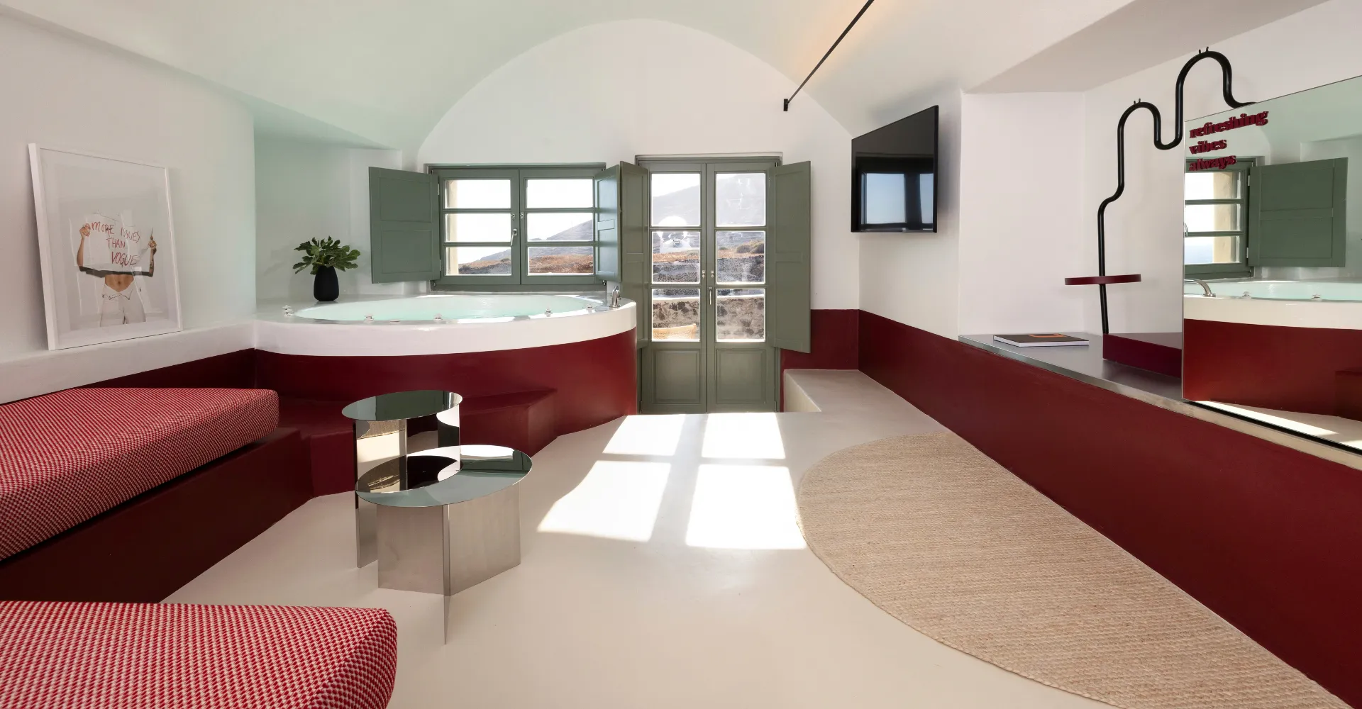 Geometric patterns, bold red accents, and playful details define this stylish suite. Relax in the indoor jacuzzi or on your cozy balcony with side sea views. Includes Marshall speaker, Naxos Apothecary amenities, fashion displays, bijouterie, shoe forms, hatbox and exclusive Neema brand extras for an inspired Santorini escapade.