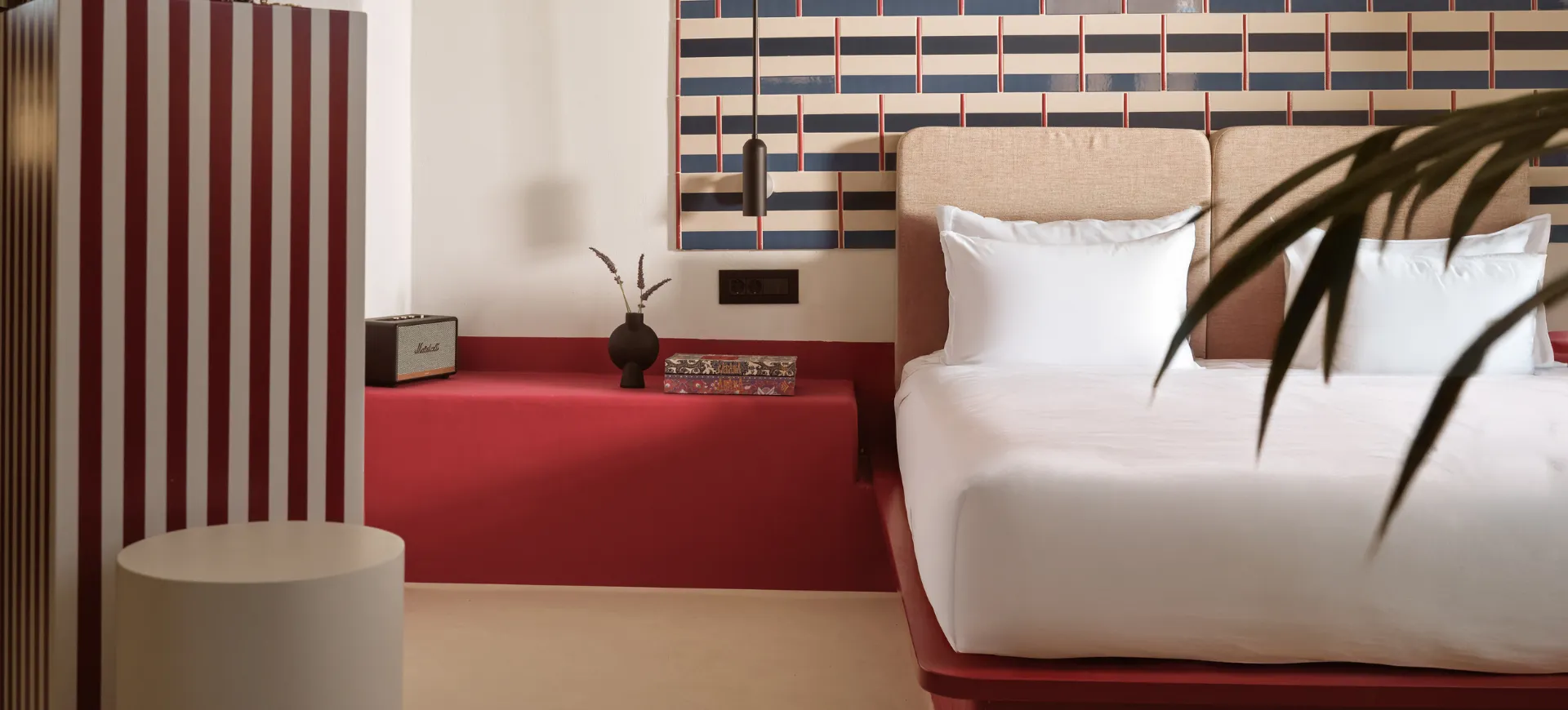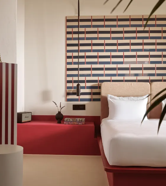 Sarong Hideaway invites you to unwind in vibrant interiors, playful graphic patterns, and calming side sea views from your breezy balcony. Marshall speaker, Naxos Apothecary amenities, bijouterie, shoe forms, hatbox, fashion showcases, and Neema brand extras complete the experience for true island indulgence.