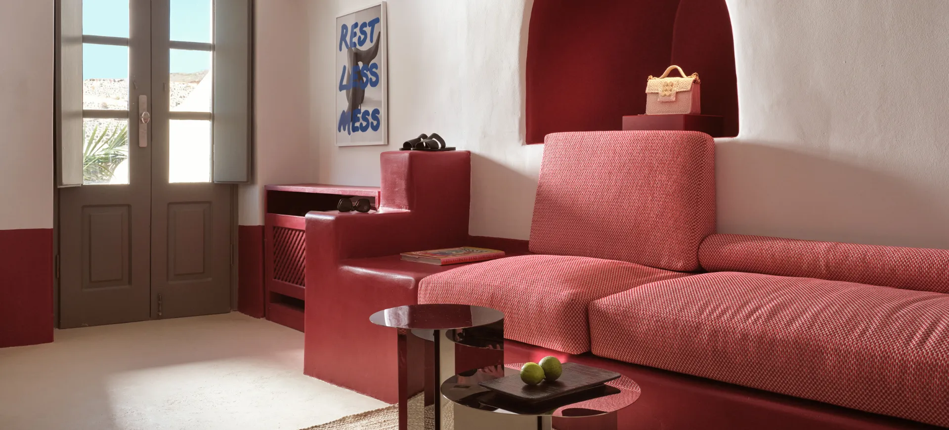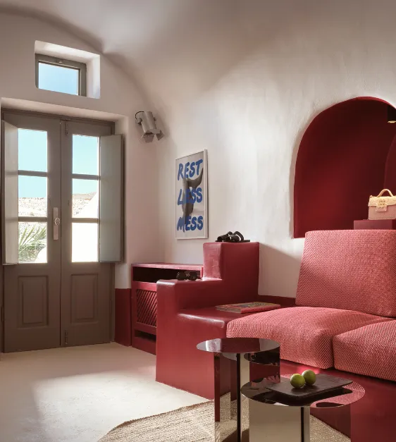 Sunhat Cove features soft curved walls, bold red accents, and a large yard with stunning side sea views. Includes a fully equipped kitchen, Marshall speaker, Naxos Apothecary amenities, bijouterie, shoe forms, hatbox, fashion displays, and exclusive Neema brand extras for your fashionable island retreat.