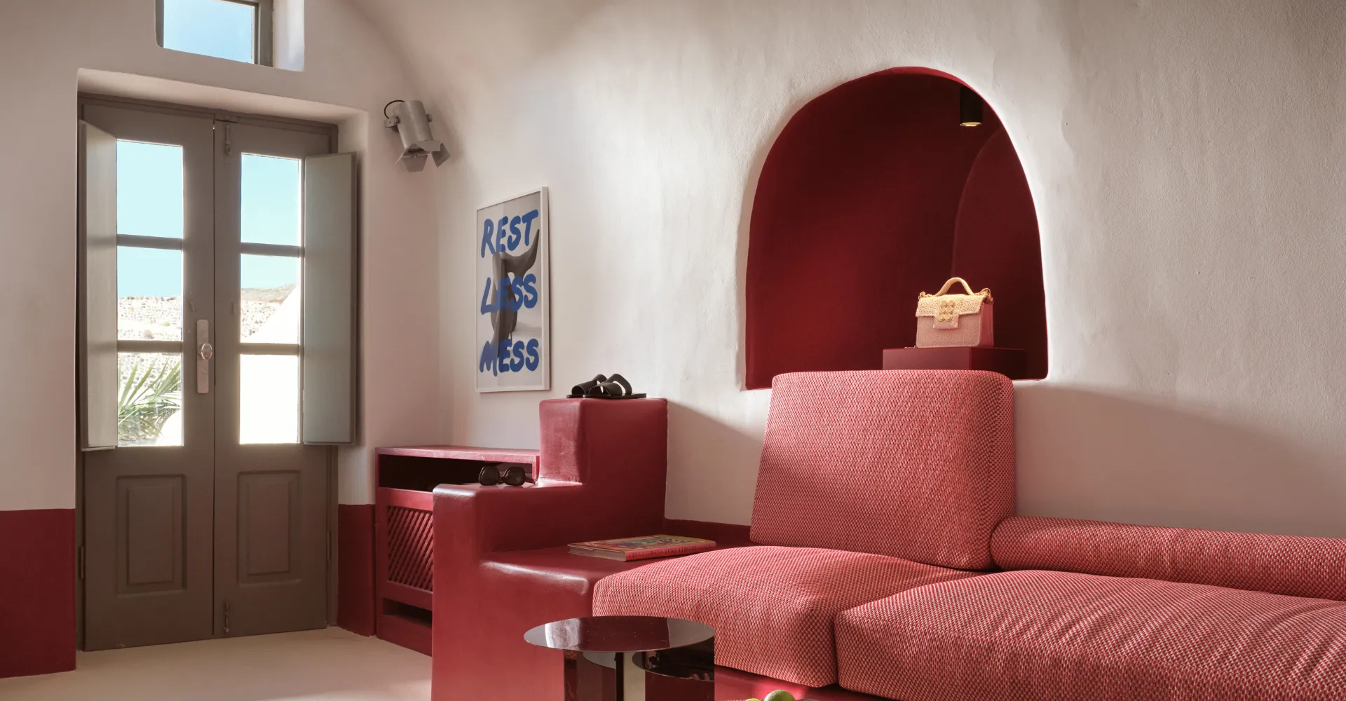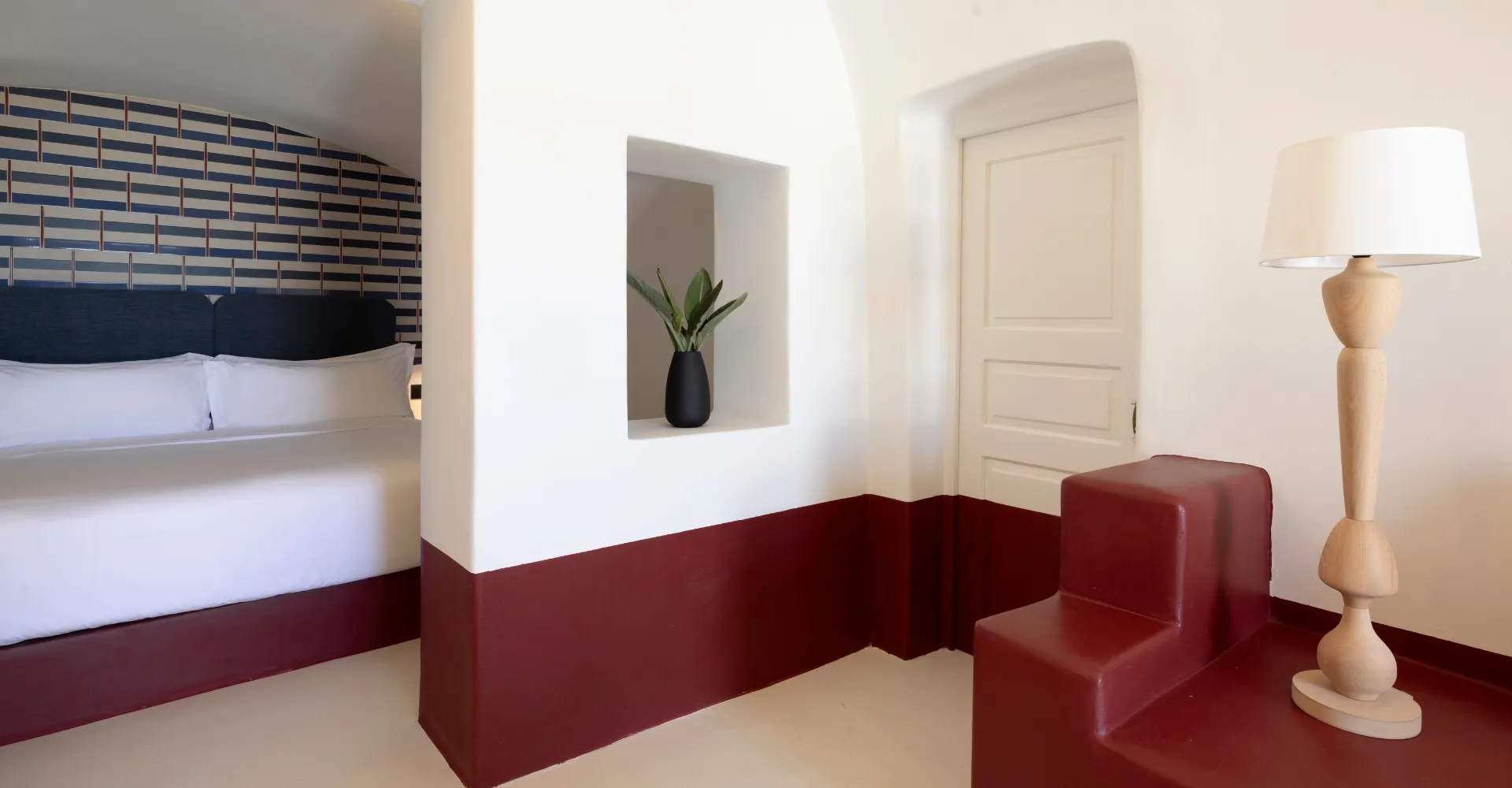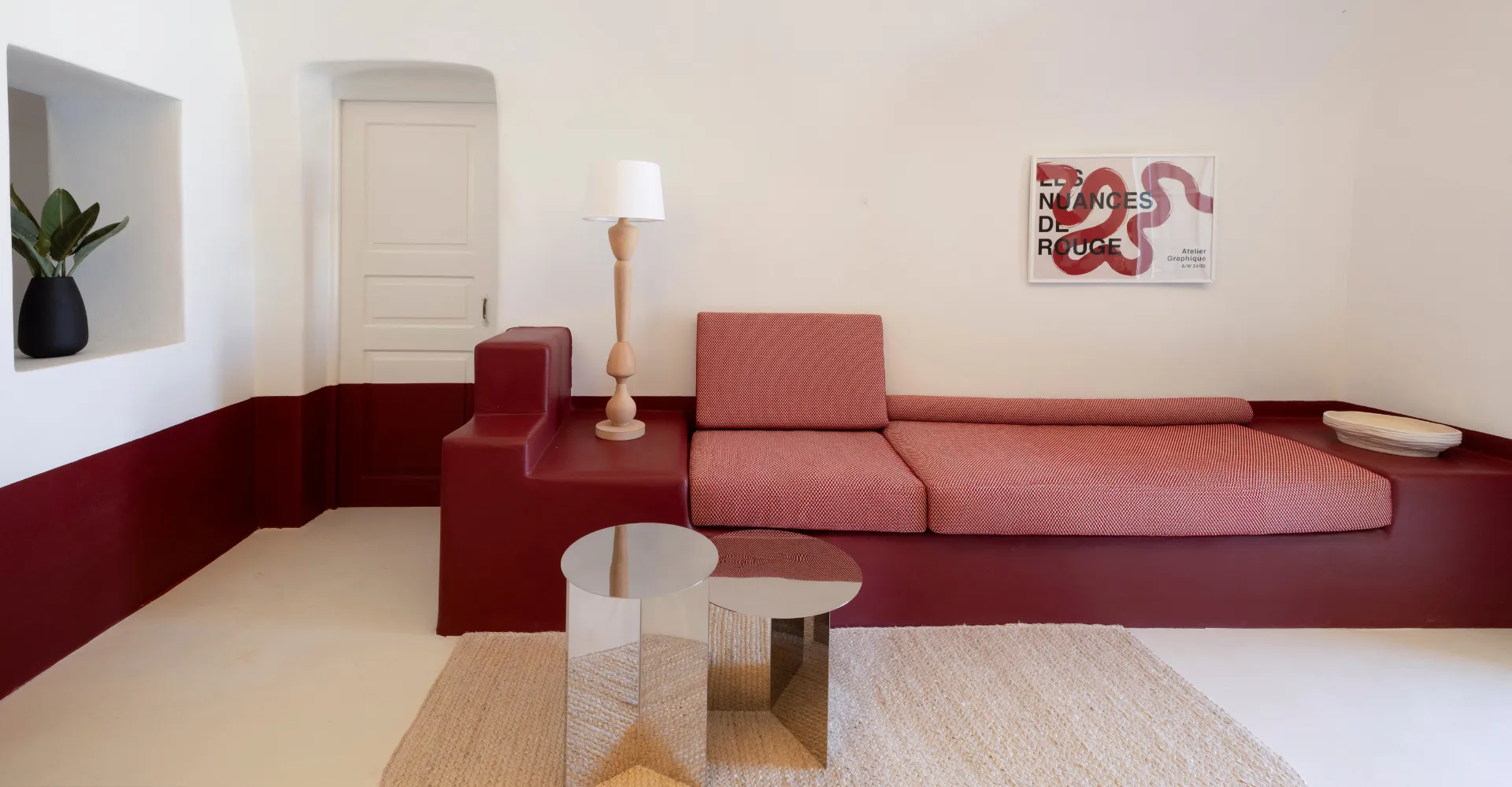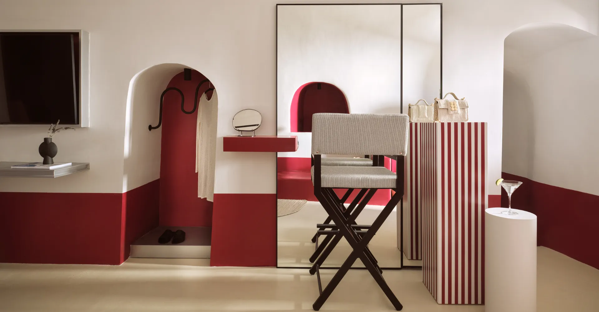 Sunhat Cove features soft curved walls, bold red accents, and a large yard with stunning side sea views. Includes a fully equipped kitchen, Marshall speaker, Naxos Apothecary amenities, bijouterie, shoe forms, hatbox, fashion displays, and exclusive Neema brand extras for your fashionable island retreat.