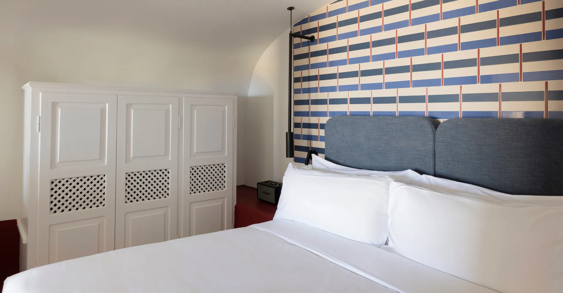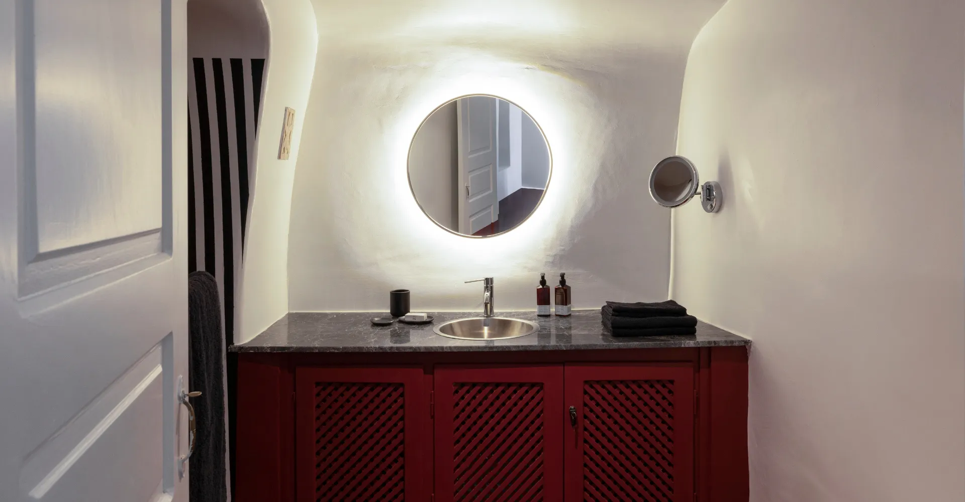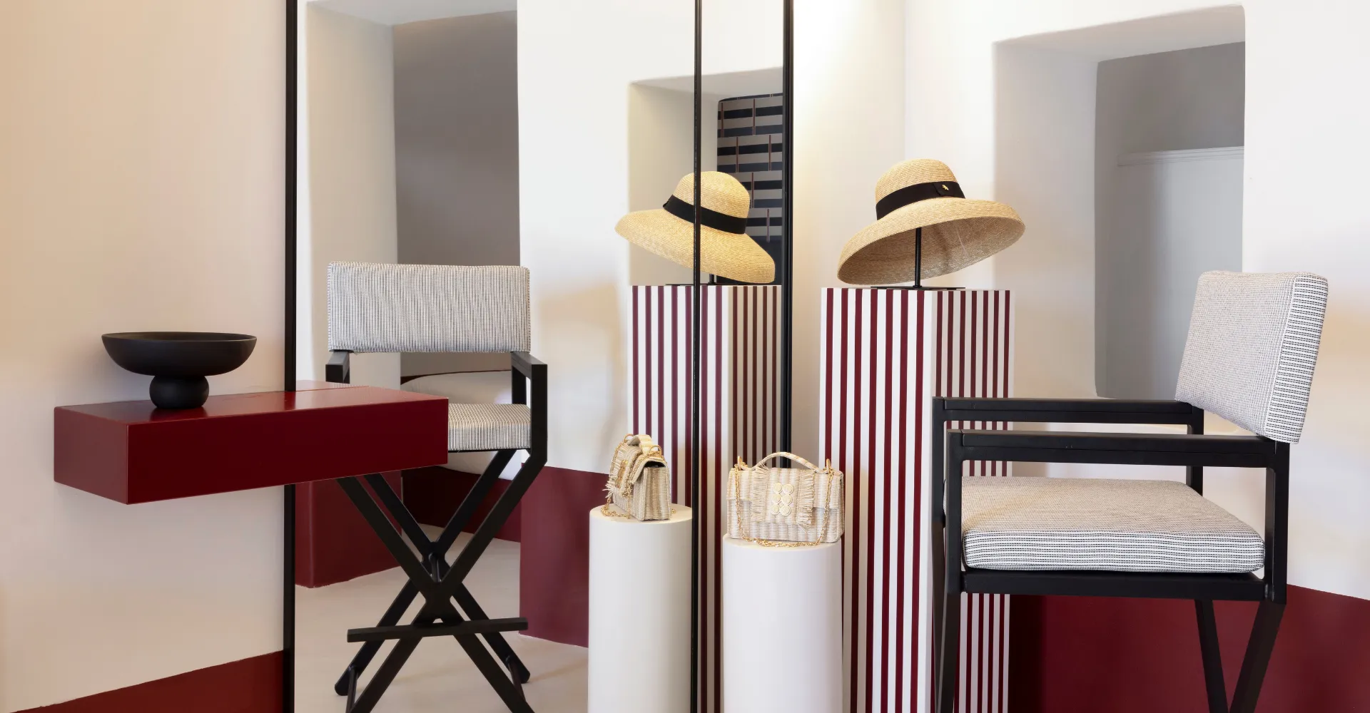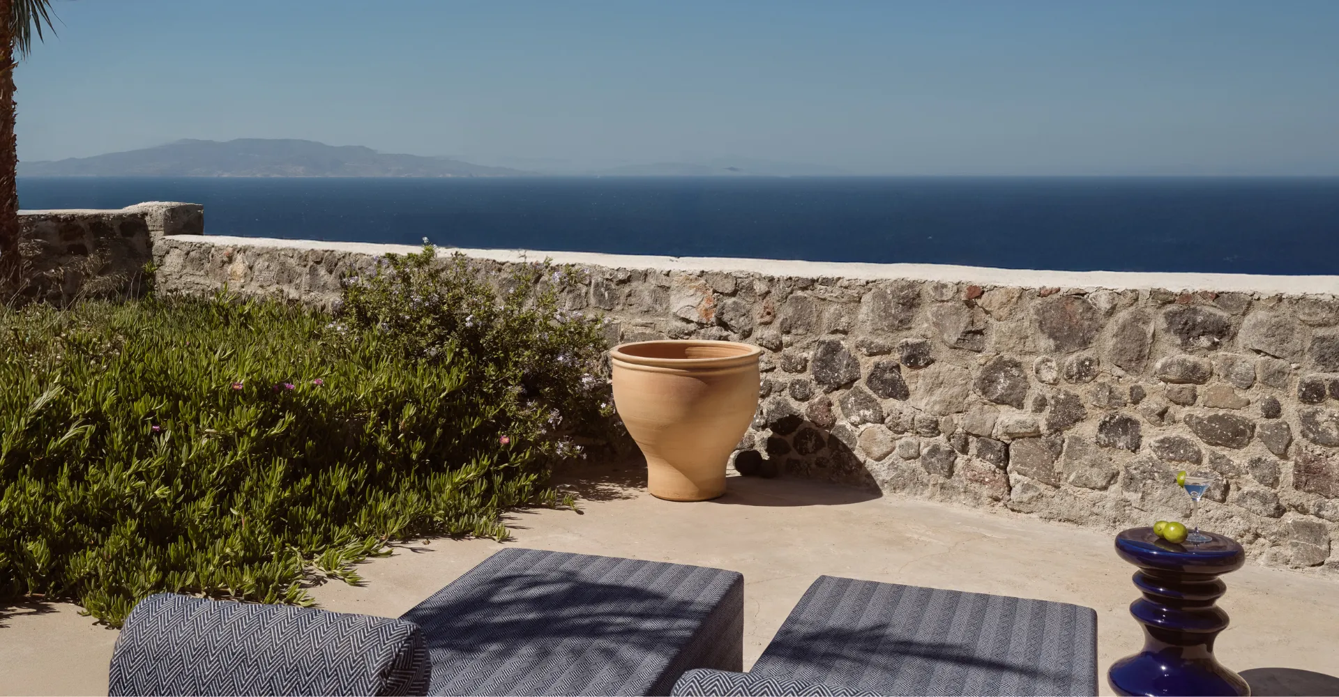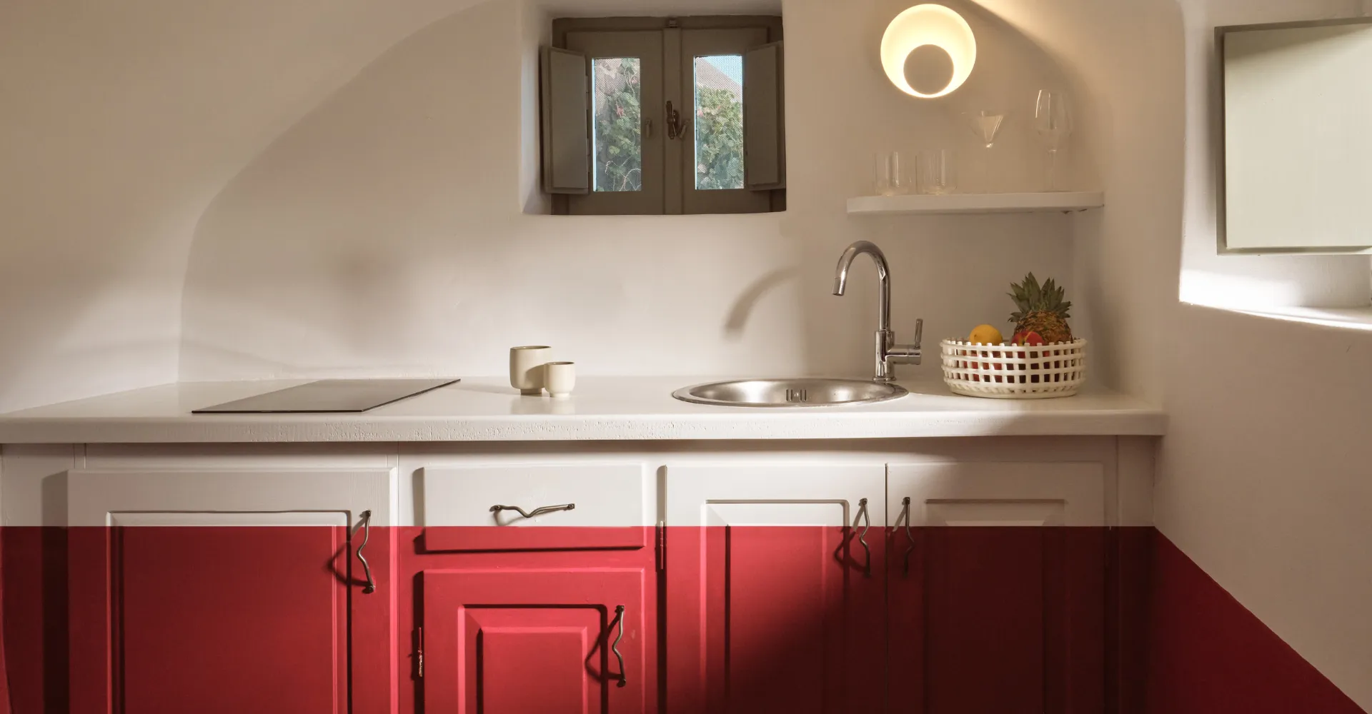 Sunhat Cove features soft curved walls, bold red accents, and a large yard with stunning side sea views. Includes a fully equipped kitchen, Marshall speaker, Naxos Apothecary amenities, bijouterie, shoe forms, hatbox, fashion displays, and exclusive Neema brand extras for your fashionable island retreat.
