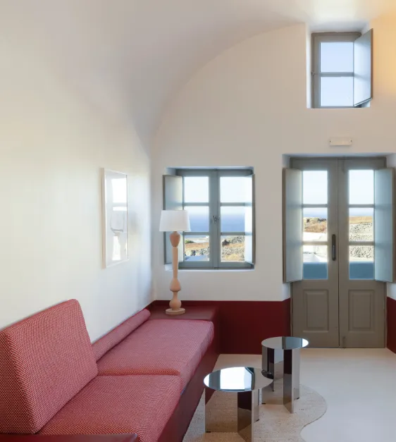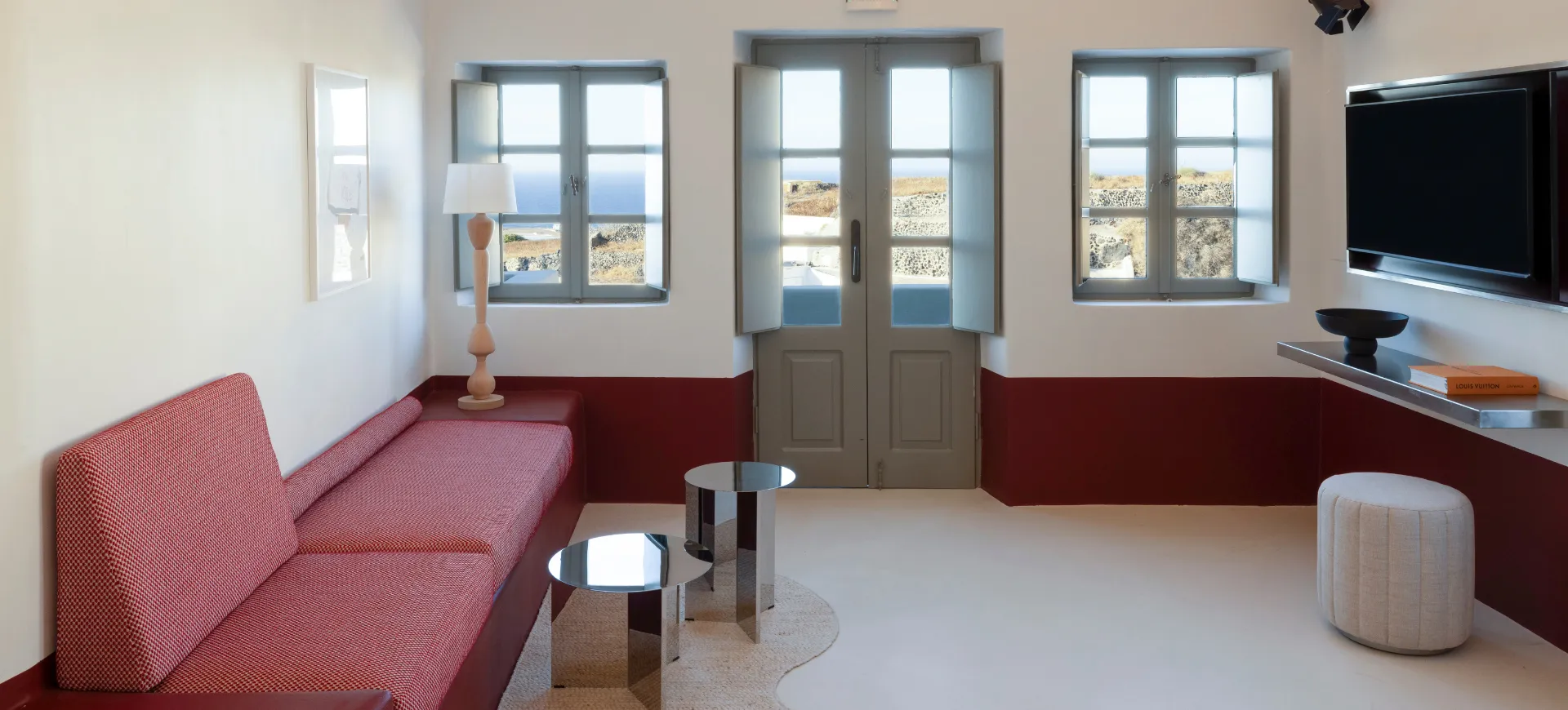 Bold red accents, modern geometric patterns, curated décor and custom furnishings bring this two-bedroom cave suite to life. Enjoy a spacious living area, fully equipped kitchen, and beautiful side sea-view yard. Marshall speaker, Naxos Apothecary amenities, Neema extras, bijouterie displays, shoe forms, hatbox and fashion vitrines complete your stay.