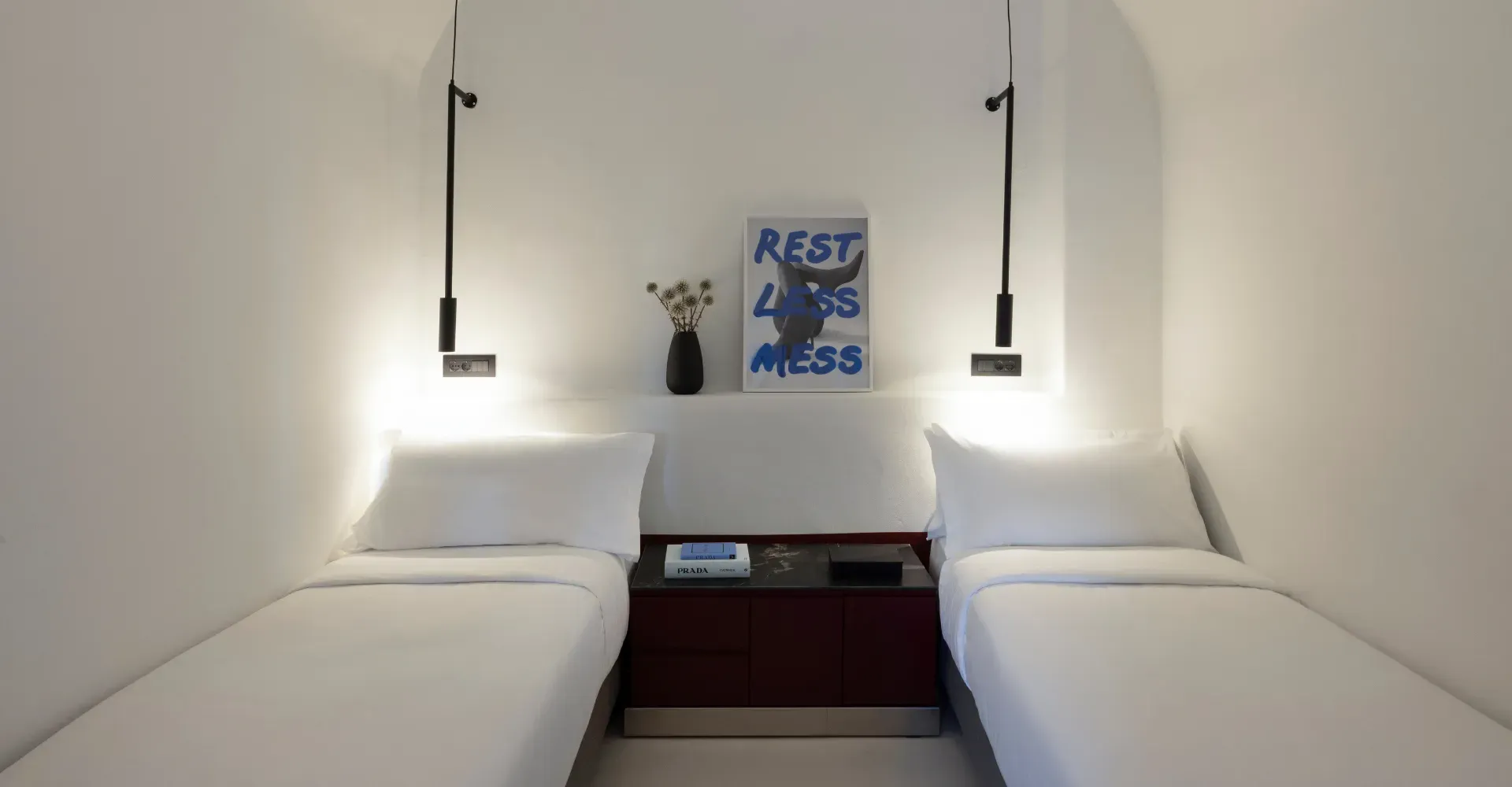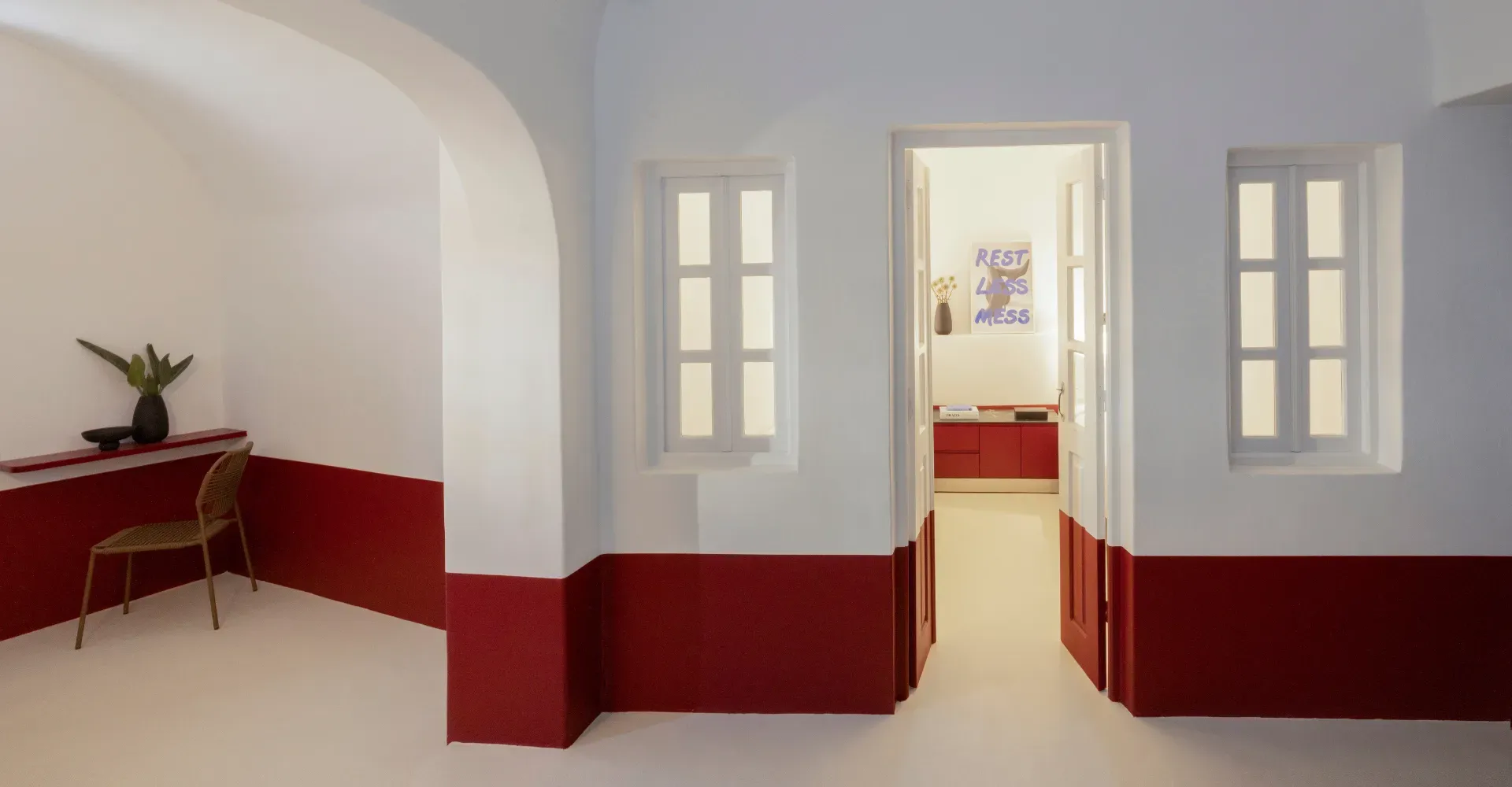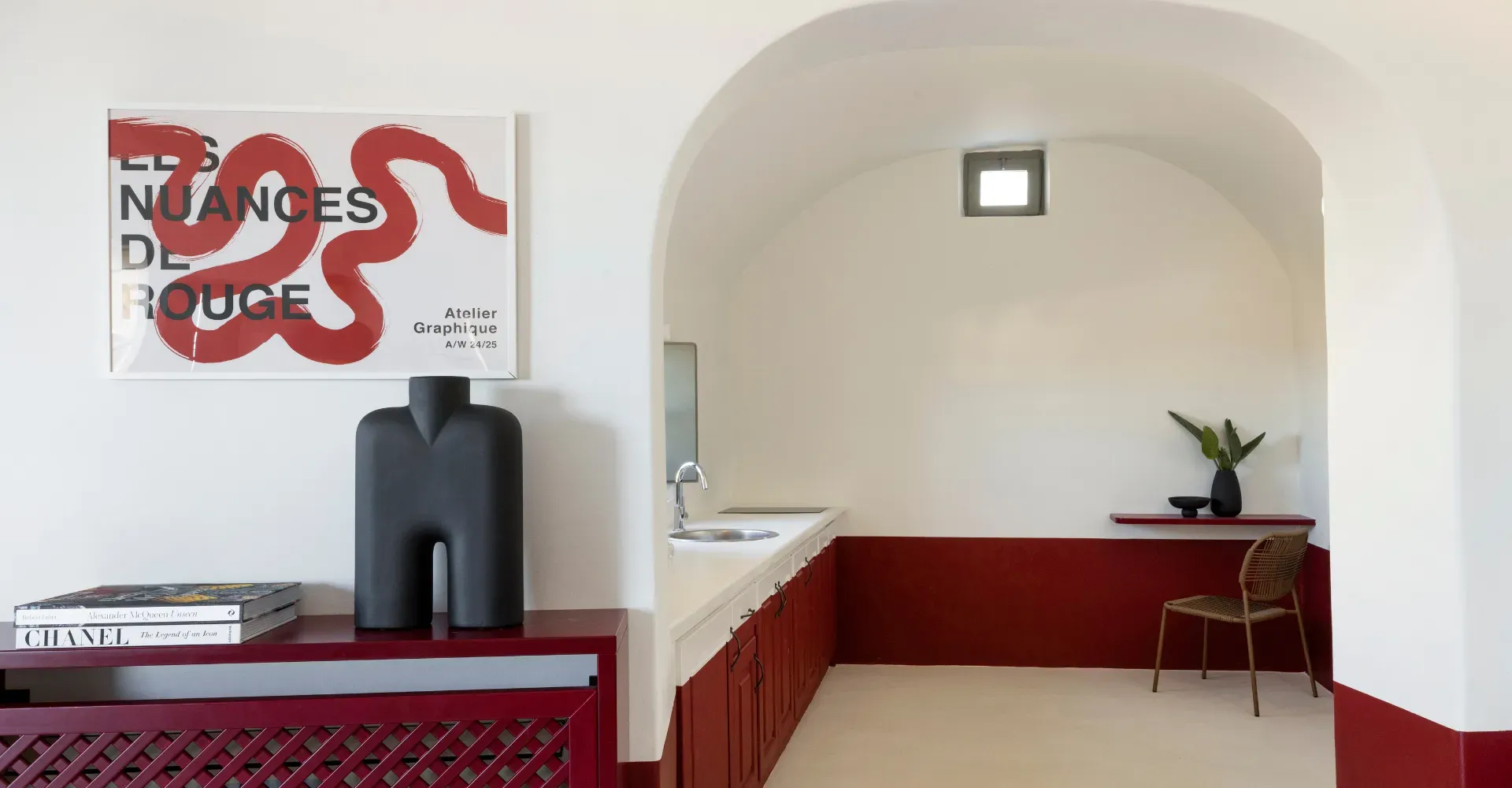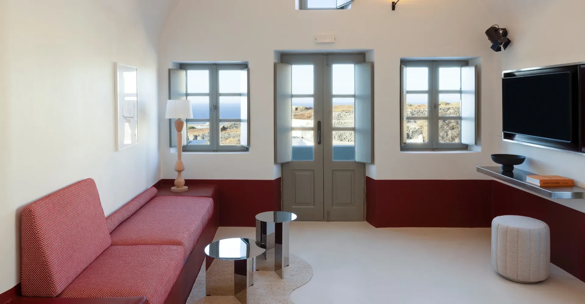 Bold red accents, modern geometric patterns, curated décor and custom furnishings bring this two-bedroom cave suite to life. Enjoy a spacious living area, fully equipped kitchen, and beautiful side sea-view yard. Marshall speaker, Naxos Apothecary amenities, Neema extras, bijouterie displays, shoe forms, hatbox and fashion vitrines complete your stay.