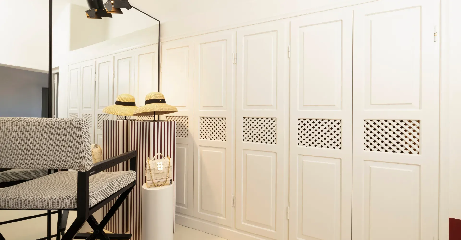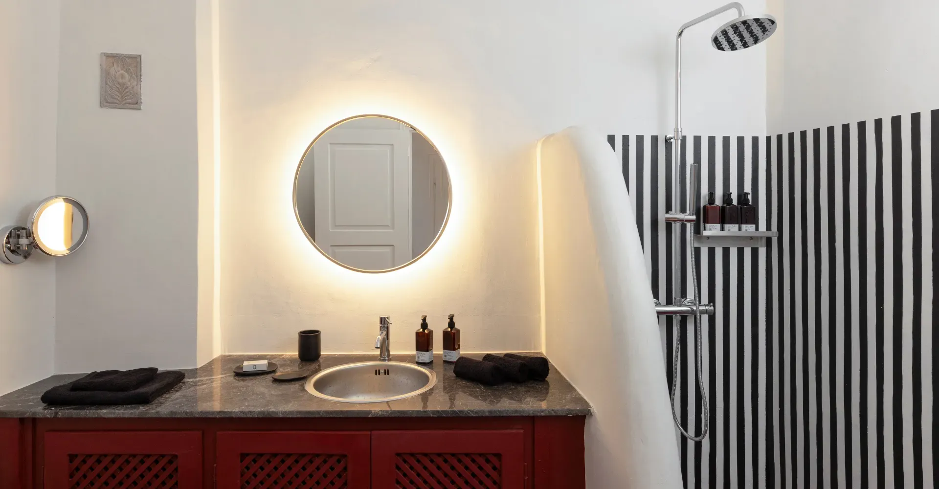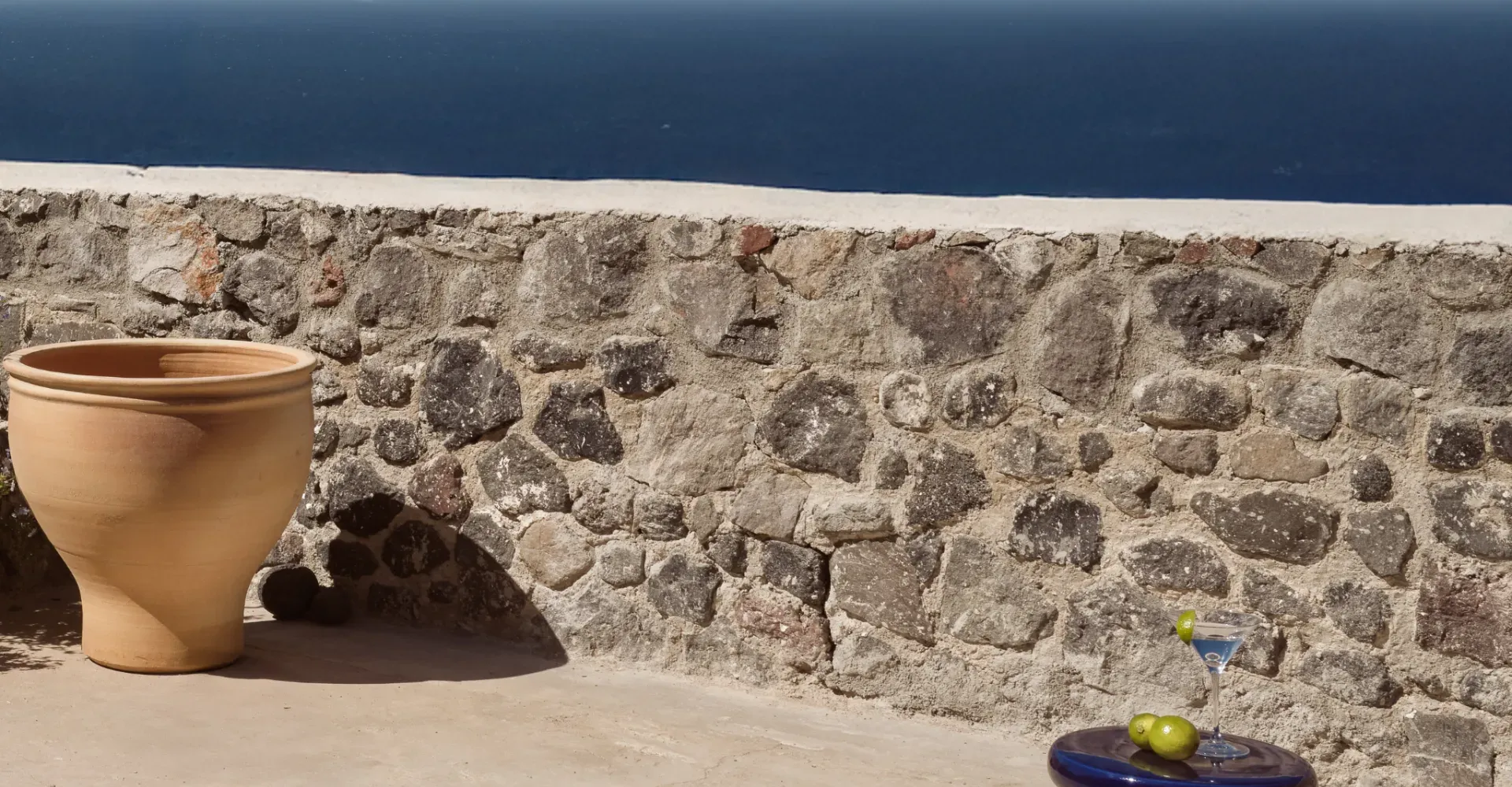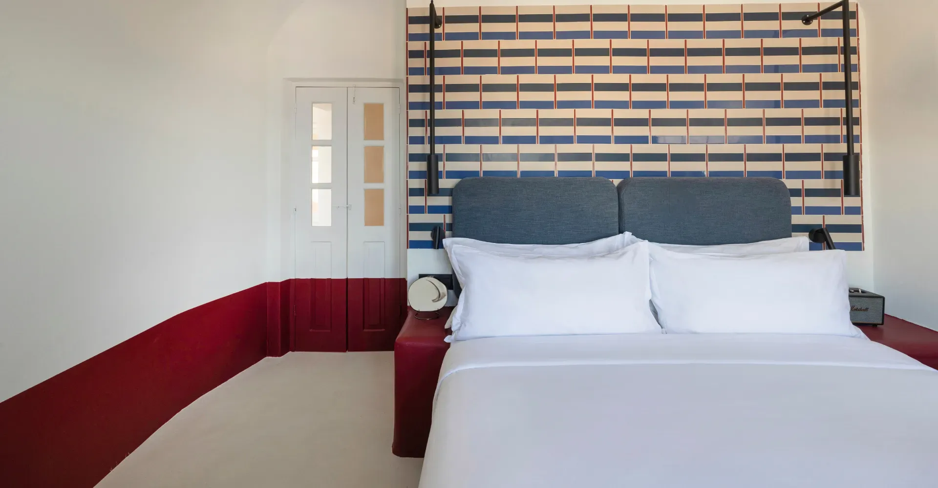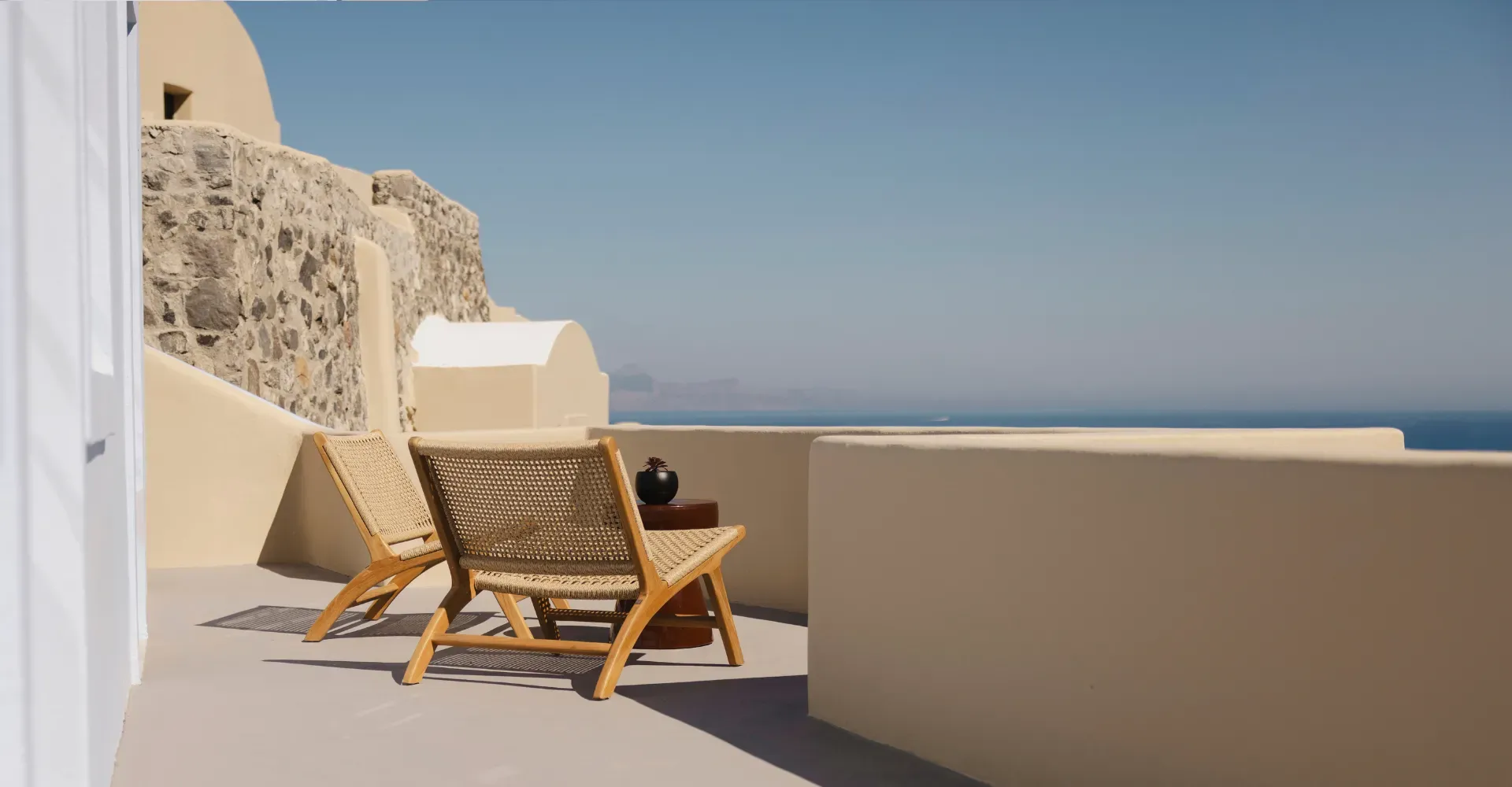 Bold red accents, modern geometric patterns, curated décor and custom furnishings bring this two-bedroom cave suite to life. Enjoy a spacious living area, fully equipped kitchen, and beautiful side sea-view yard. Marshall speaker, Naxos Apothecary amenities, Neema extras, bijouterie displays, shoe forms, hatbox and fashion vitrines complete your stay.